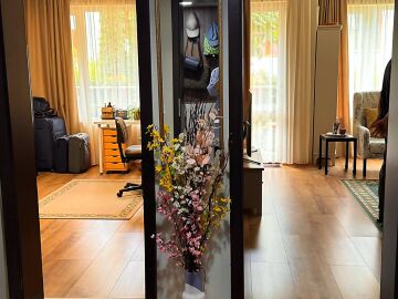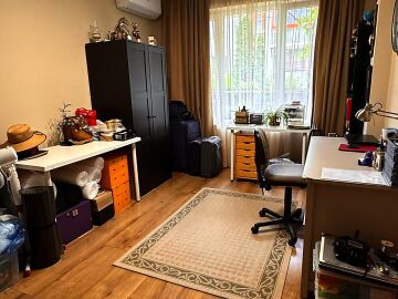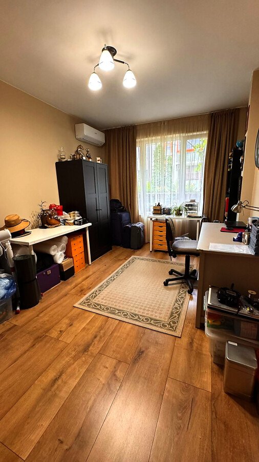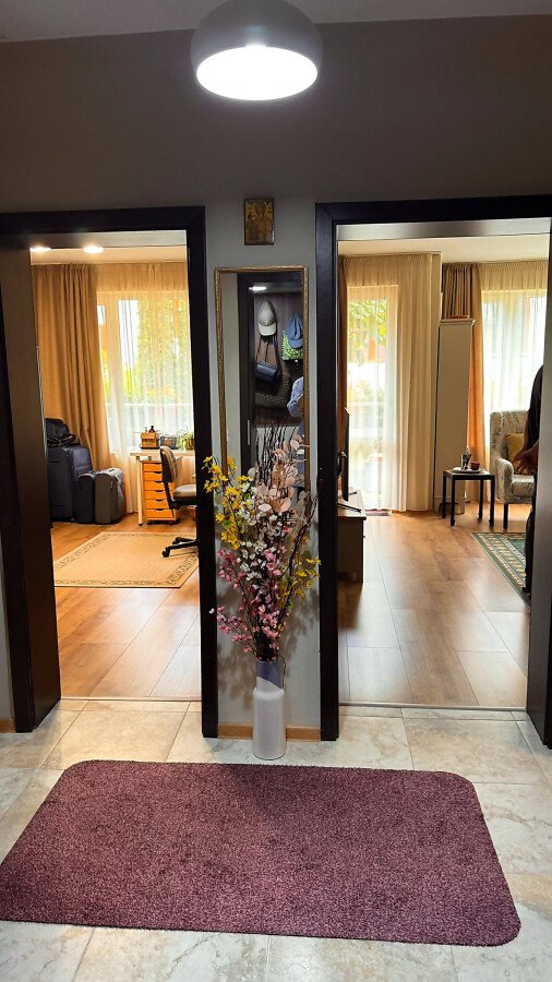Имотът е разположен на партерен етаж и се състои от два обединени апартамента. Разпределението е следното – входно антре, просторна всекидневна, офис, дрешник, тераса с гледка към озеленения двор, баня с тоалетна и душ кабина, коридор, голяма трапезария с обособен кухненски кът, уютна спалня, втора баня с тоалетна и душ кабина, още една тераса с гледка към двора. Общата площ на двата апартамента е 151 кв.м.