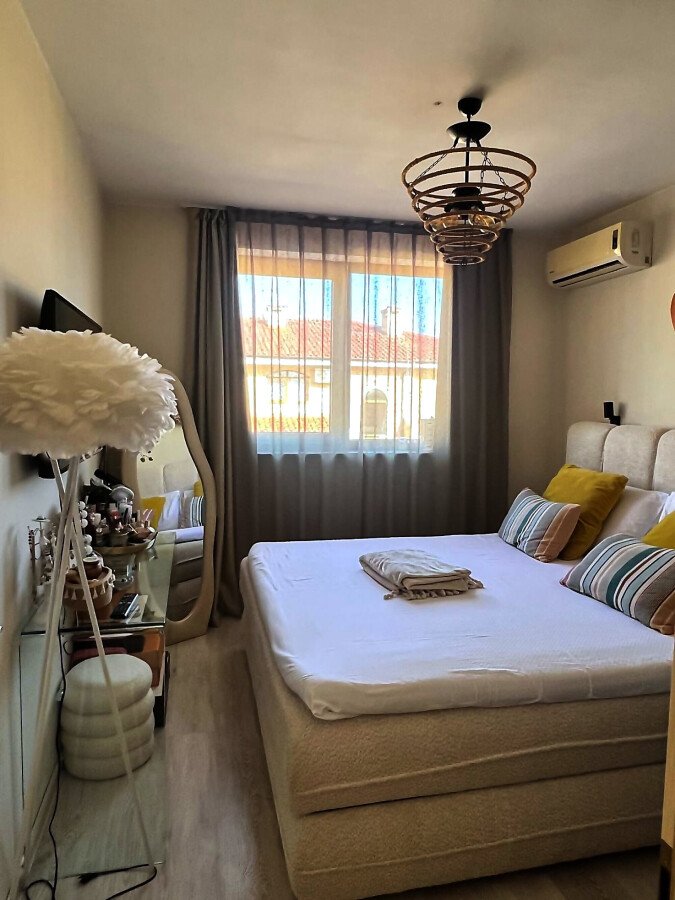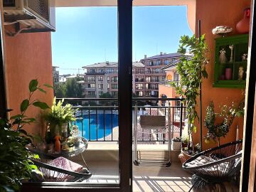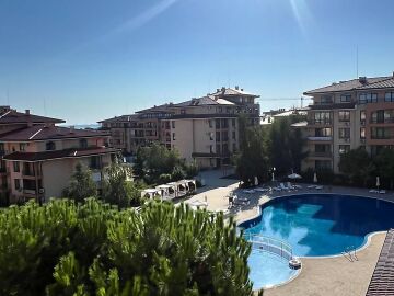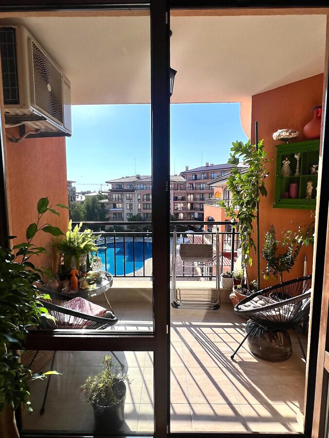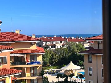 Предлагаме за продажба уютен двустаен апартамент с площ 56,06 кв.м., разположен на четвърти етаж в престижния комплекс „Стар Дриймс“ в Свети Влас. Жилището се състои от просторна всекидневна с кухненски бокс, спалня, баня с тоалетна и балкон, който разкрива приятна гледка към основния басейн и детската площадка, както и частична морска панорама. Апартаментът е напълно обзаведен и оборудван, готов за нанасяне веднага и е подходящ както за лично ползване, така и за инвестиция с цел отдаване под наем.
