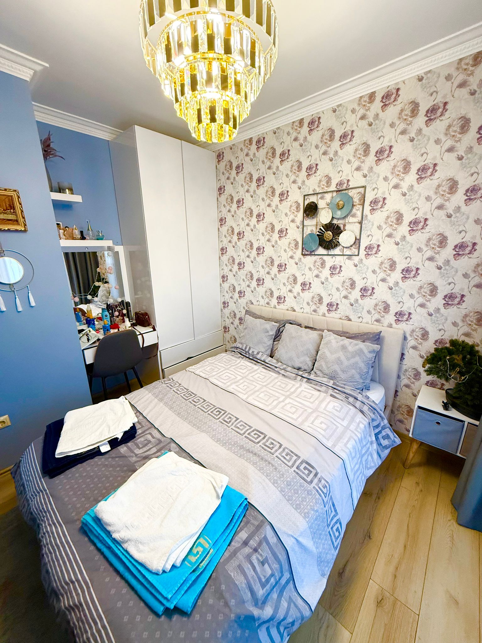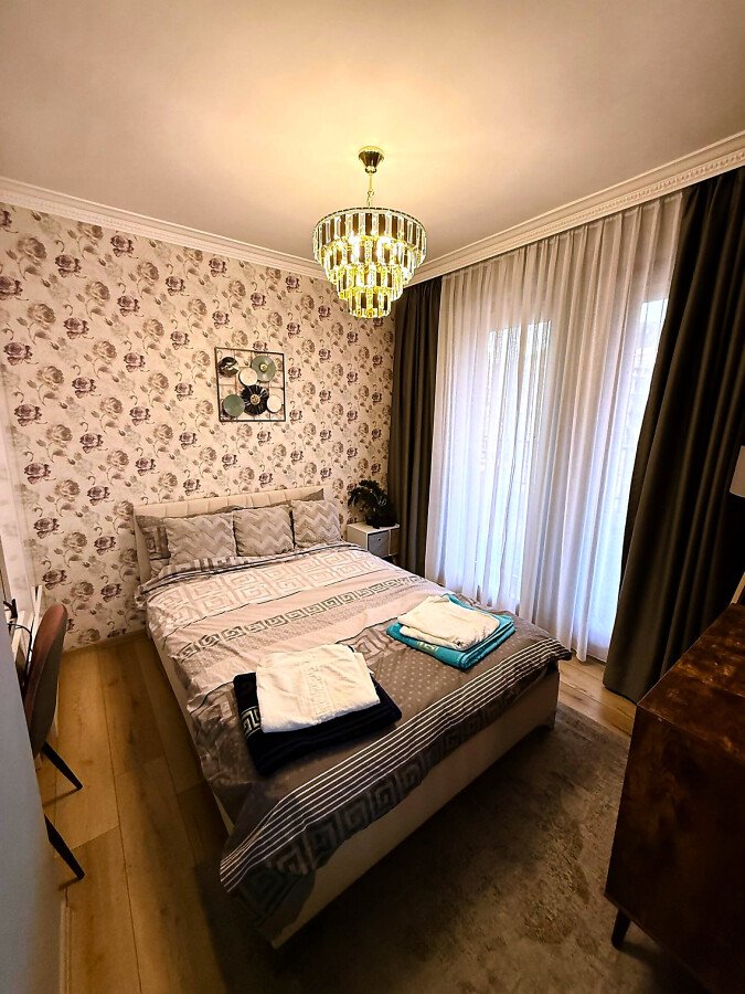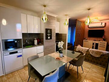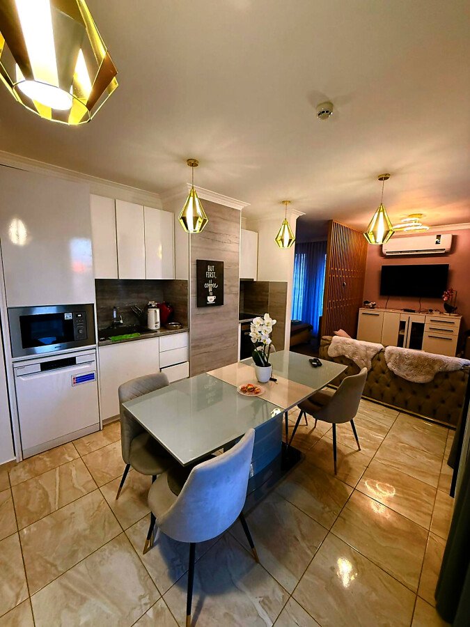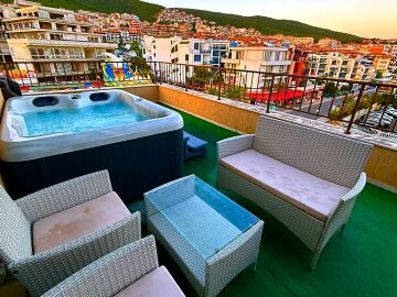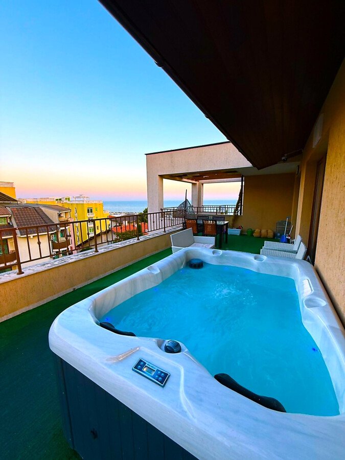 Апартаментът е луксозно обзаведен, разположен на последния етаж на сградата. Състои се от входно антре, всекидневна с кухненски бокс и кът за хранене, обособена спалня, баня с тоалетна и душ кабина, много голяма тераса с джакузи и невероятна гледка към морето и планината. Имотът се продава напълно обзаведен с качествени и луксозни мебели и оборудван с всички необходими електроуреди.