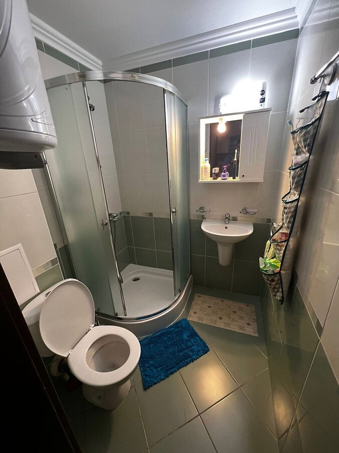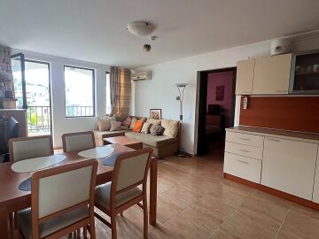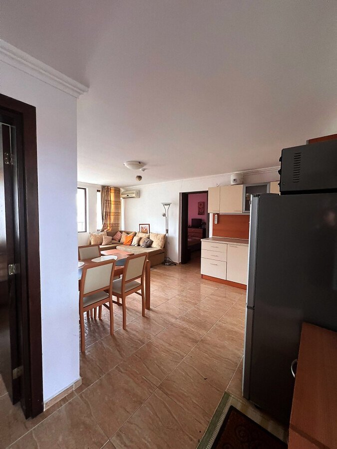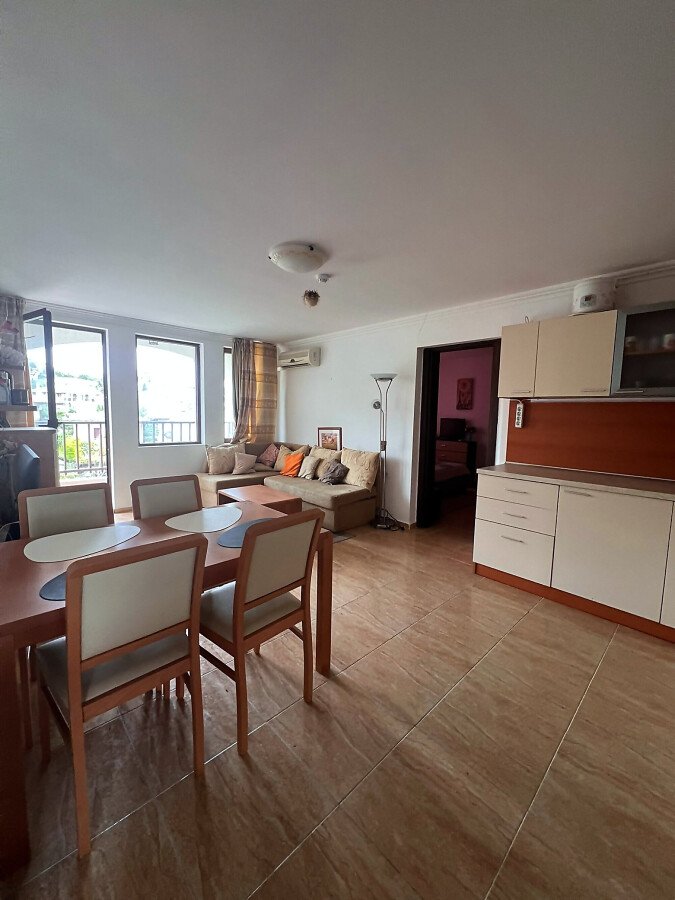 Апартаментът има следното разпределение – входно антре, просторна всекидневна с кухненски бокс и кът за хранене, две самостоятелни спални, две бани, всяка оборудвана с душ кабина, голяма тераса. Разпределението е функционално и осигурява комфорт както за постоянно живеене, така и за почивка през летния сезон. Всекидневната е светла и приветлива, с директен излаз към терасата, от която се разкрива панорамна гледка към морето и басейна на комплекса. Имотът е напълно обзаведен и оборудван, готов за нанасяне.