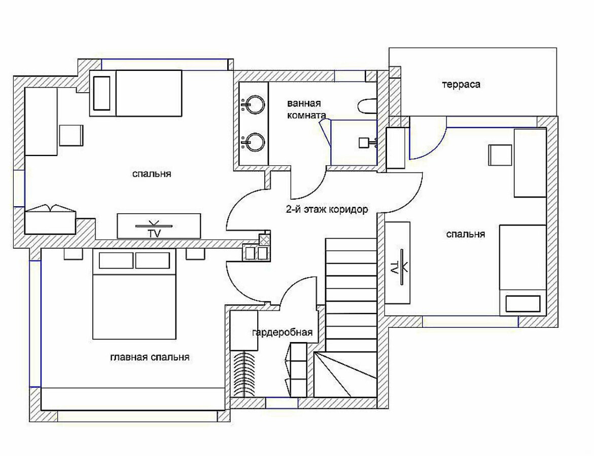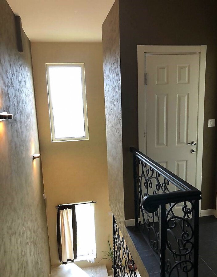 На втория етаж има три спални, баня с тоалетна и гардеробна.