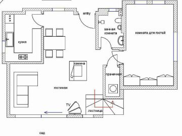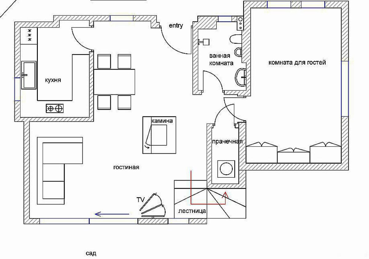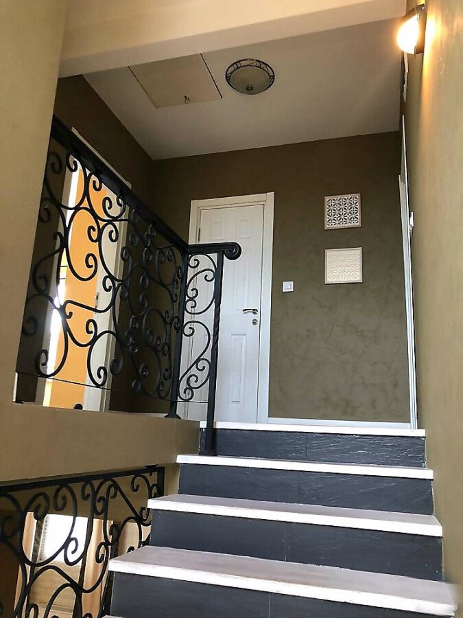 На първия етаж на къщата има напълно оборудвана самостоятелна кухня, просторен хол с открита трапезария, баня с тоалетна, мокро помещение и офис.