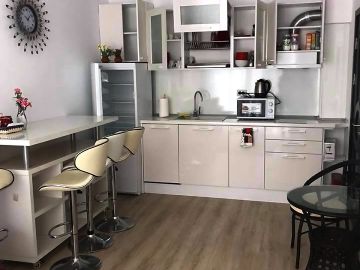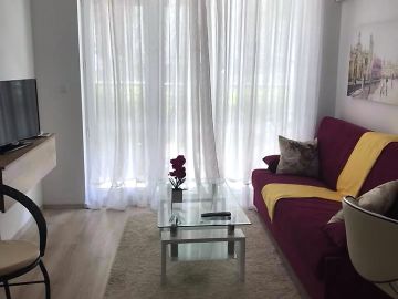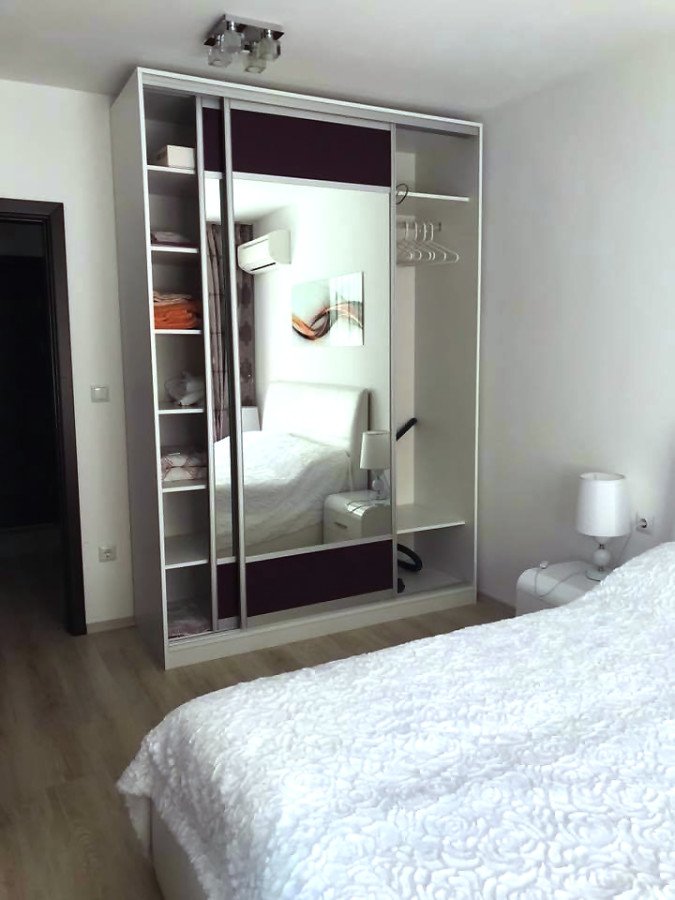 Апартаментът, който Ви предлагаме е с площ 52 кв.м и е разположен на първия етаж. Състои се от дневна с обособена кухненска част с вградено кухненско обзавеждане, една спалня, баня и тераса. Имотът е професионално ремонтиран – подовите настилки са ламинат и теракот, стените са боядисани с латекс, има PVC дограма. Всички електрически и ВиК инсталации са свързани, прекарани са комуникации за осигуряване на интернет и телевизия. Апартаментът се предлага напълно обзаведен, разполага и с климатик.
