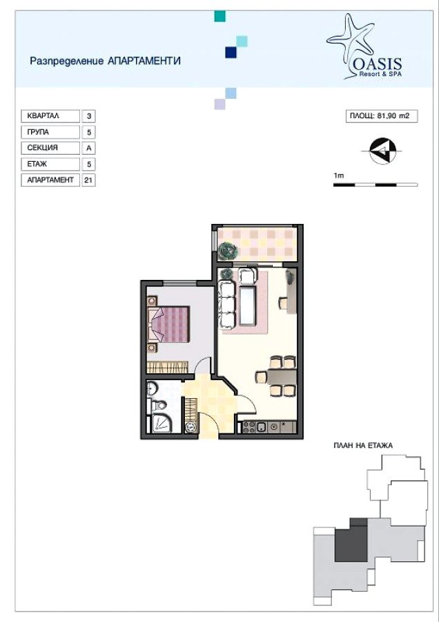 Представяме на Вашето внимание прекрасен и просторен апартамент с площ от 82 кв.м., разположен на 5-тия етаж в комплекс "Оазис Бийч Ризорт" в Лозенец.