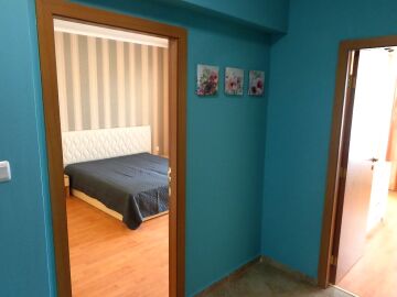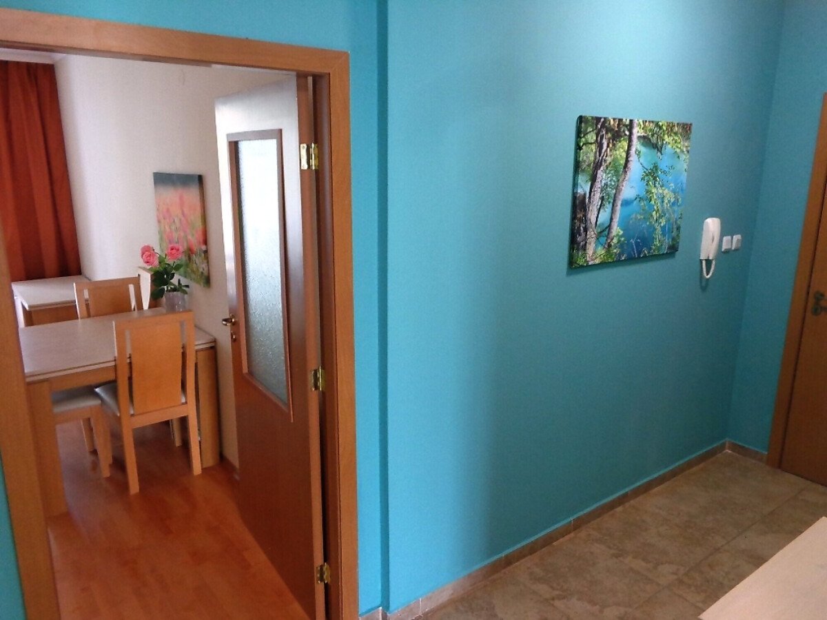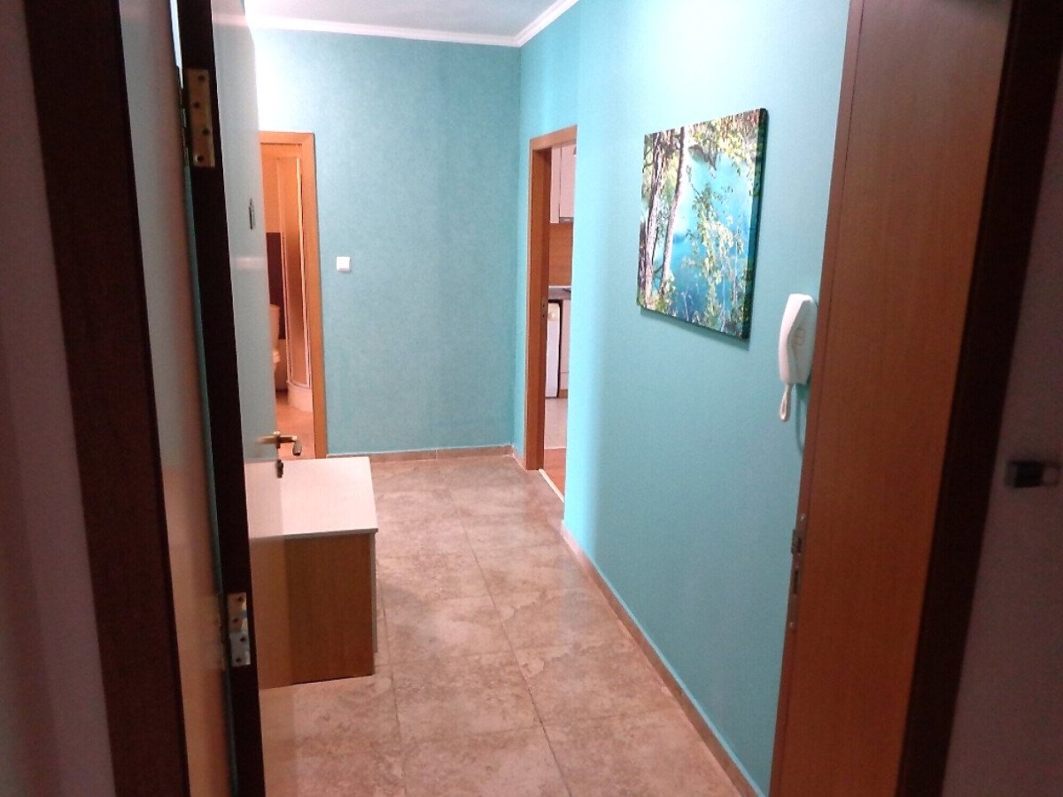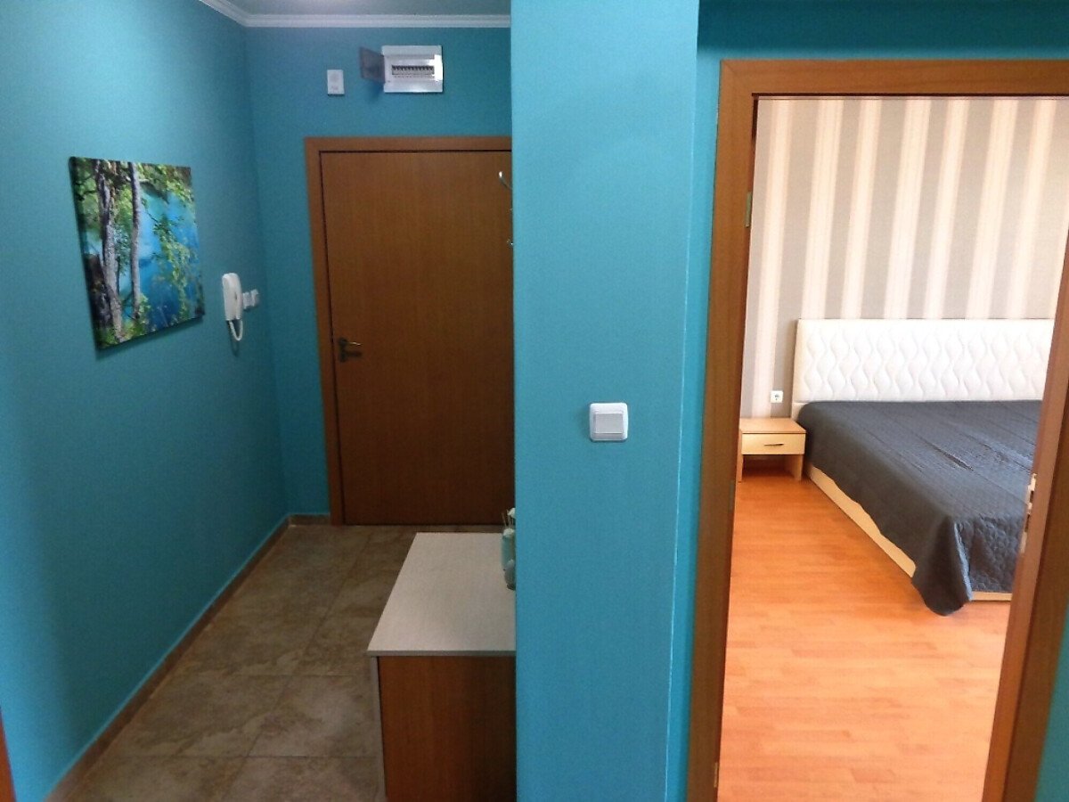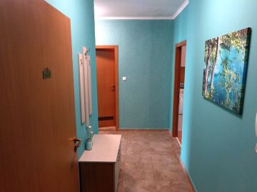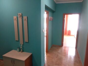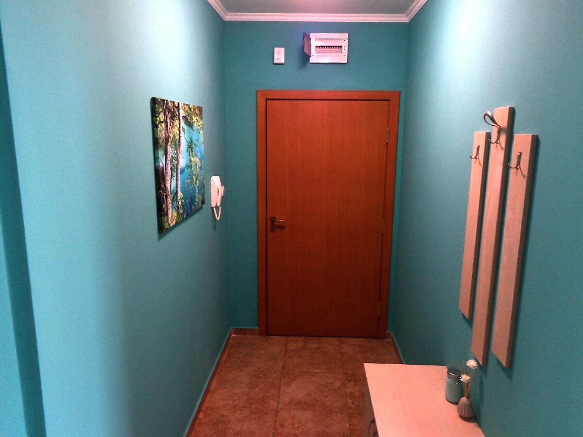 Коридорът е широк и боядисан в свежо синьо, с шкаф за обувки и закачалки.