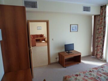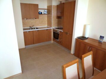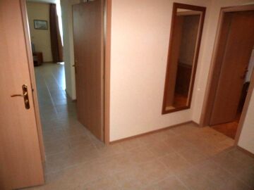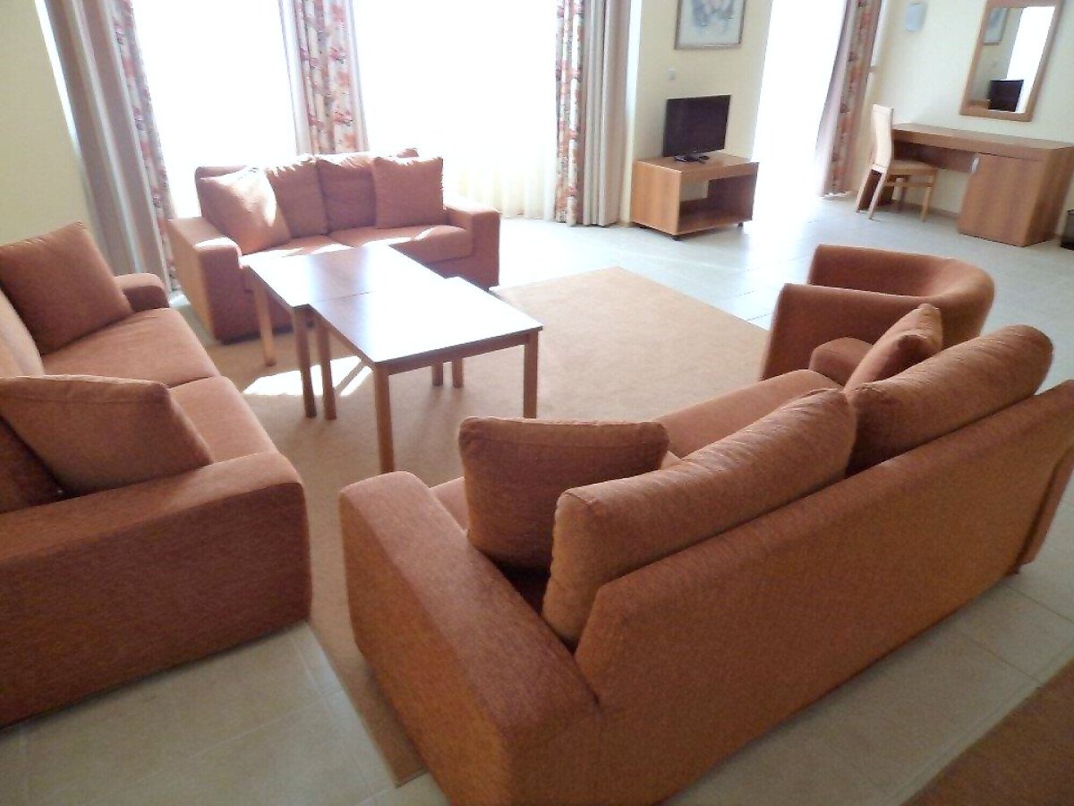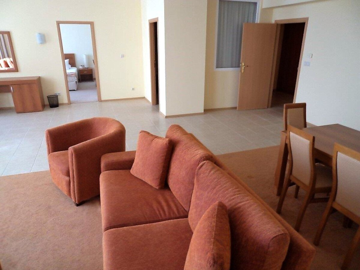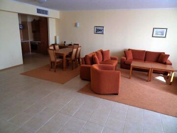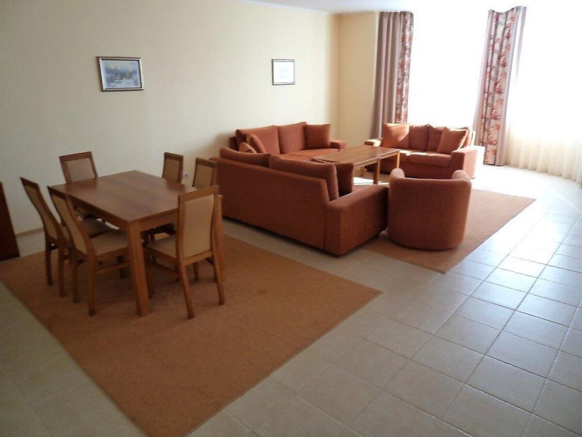 Апартаментът е много голям и просторен – състои се от огромна дневна с оборудван кухненски бокс, трапезария и масивни дивани и фотьойли за пълноценна почивка, две прекрасни спални, баня с вана и тоалетна и разкошна тераса с гледка към морето и територията на комплекса.