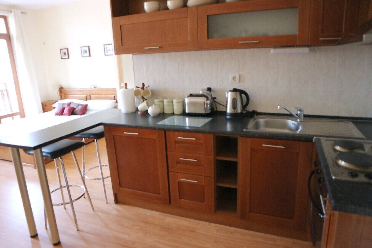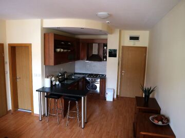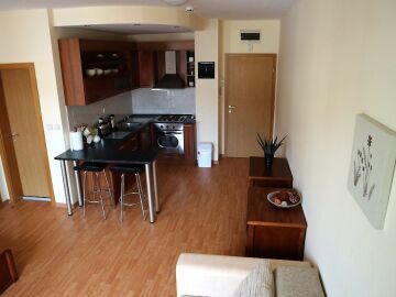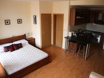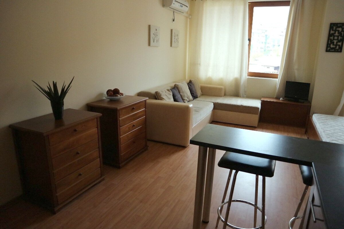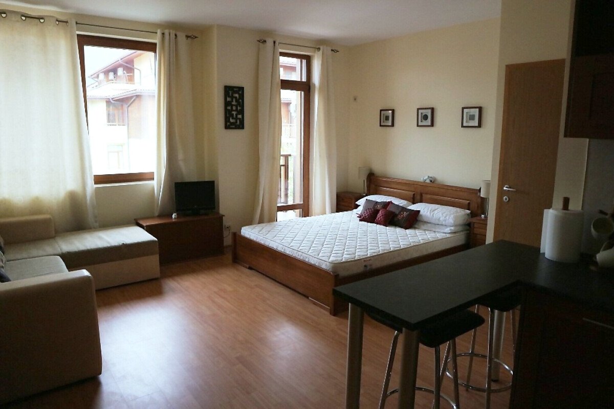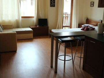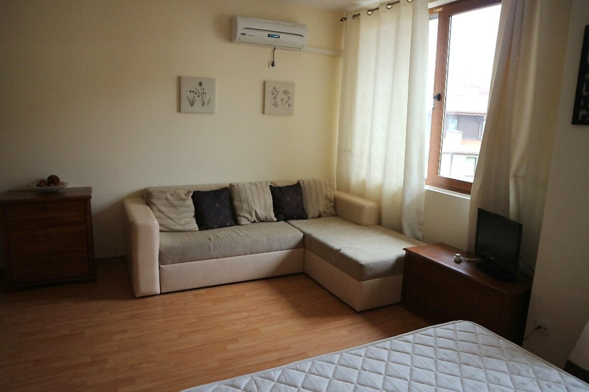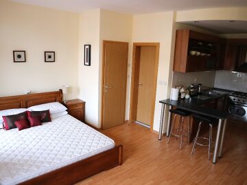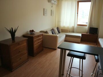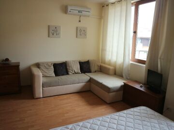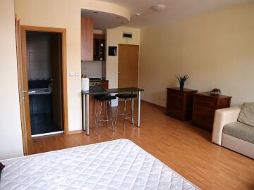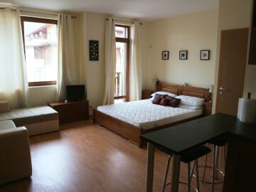 Студиото е напълно обзаведено и оборудвано с уреди. Състои се от просторно помещение с кухненски бокс, двойно легло, диван, баня с тоалетна и прекрасна тераса.