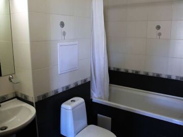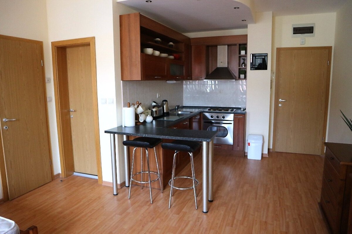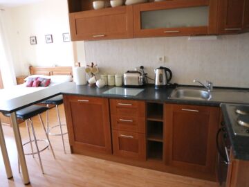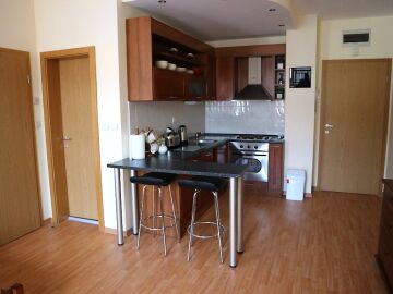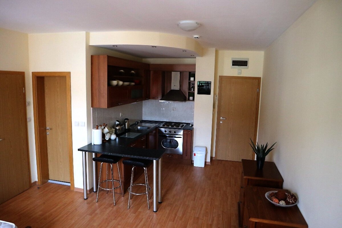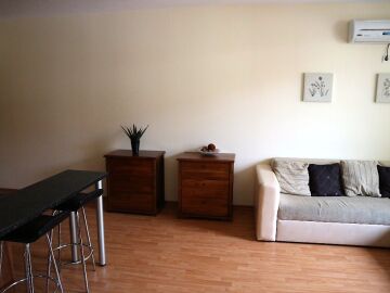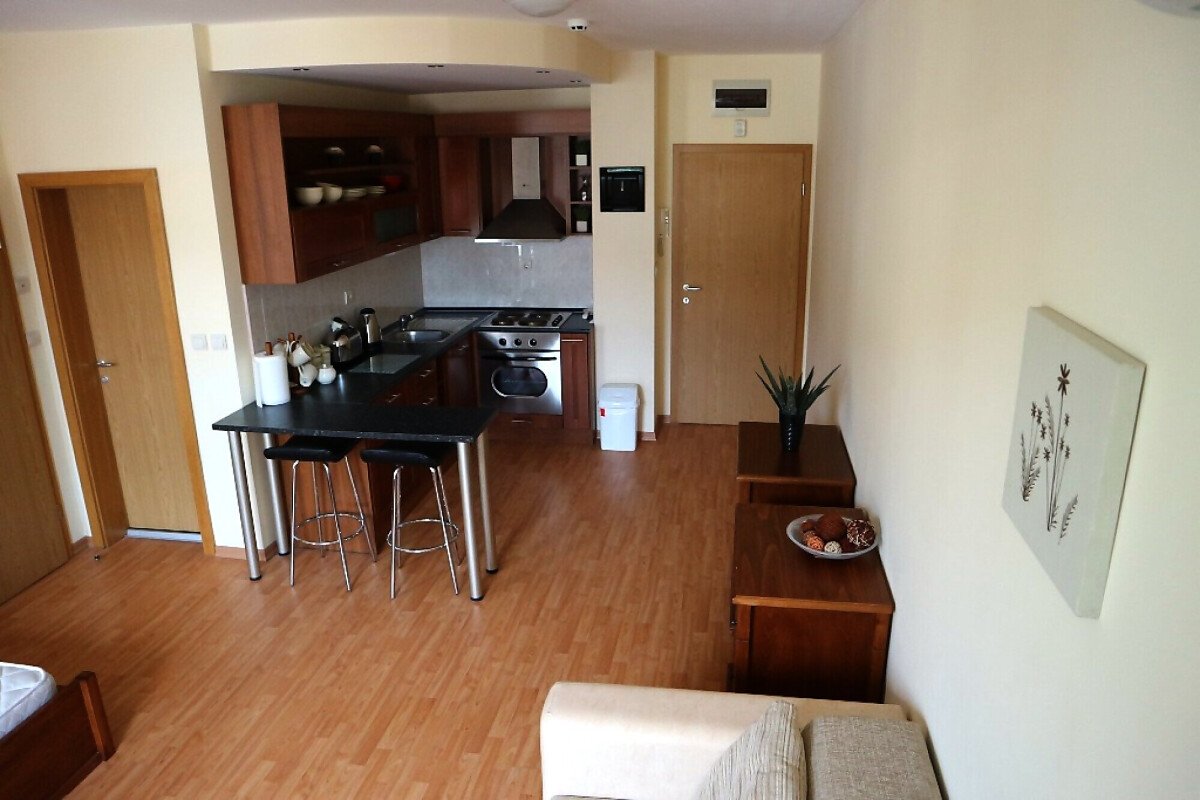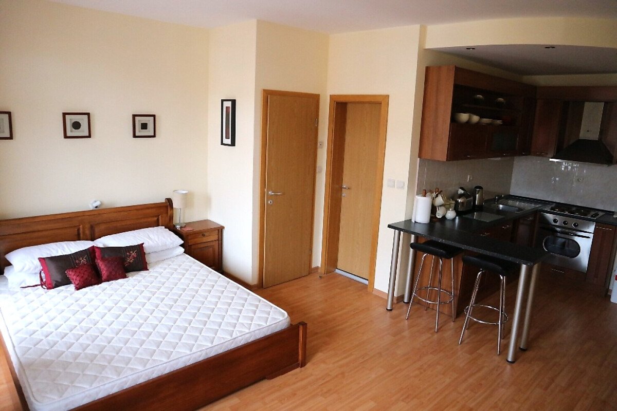 Студиото е напълно обзаведено и оборудвано с уреди. Състои се от просторно помещение с кухненски бокс, двойно легло, диван, баня с тоалетна и прекрасна тераса.