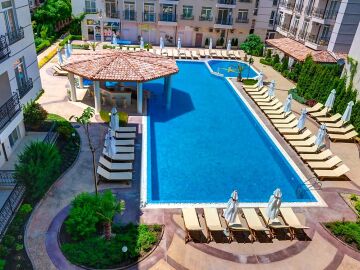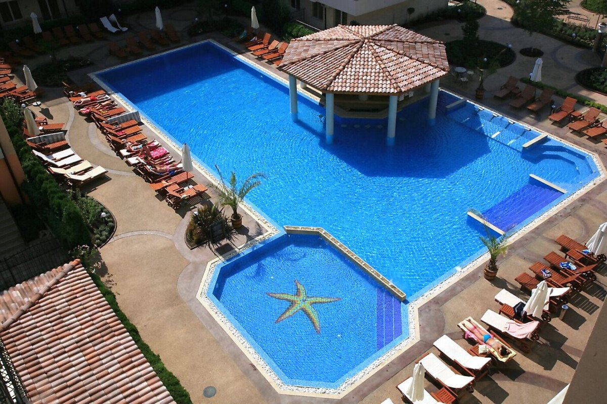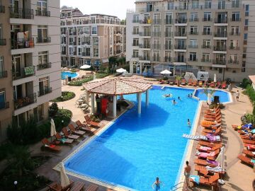 Там можете да се насладите на удобствата на два басейна, ресторант, магазин, СПА център, детска площадка и паркинг.