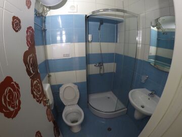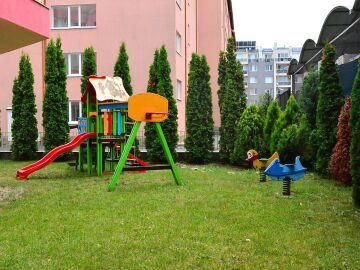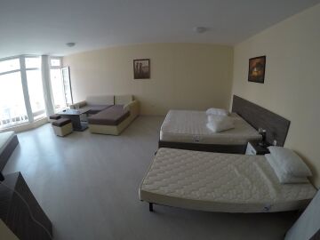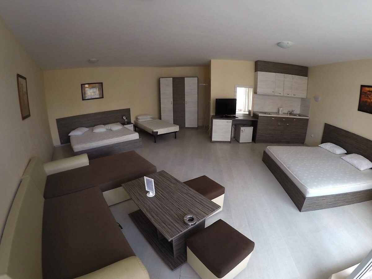 Апартаментът е разположен на партерен етаж и е изключително просторен. Разполага с две двойни легла, едно единично легло, кухненски бокс, диван с маса, телевизор и разкошна тераса.