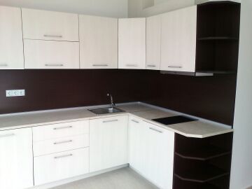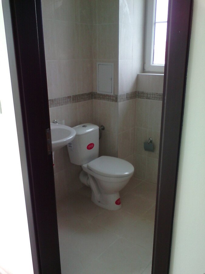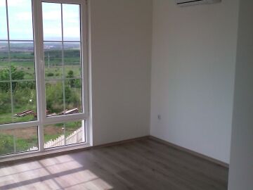 Подът е от ламинат и паркет, а панорамните прозорци придават просторност на къщата.
