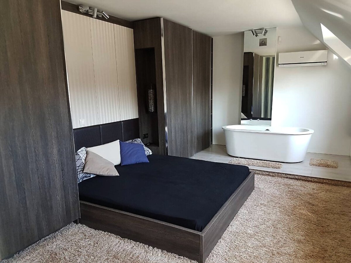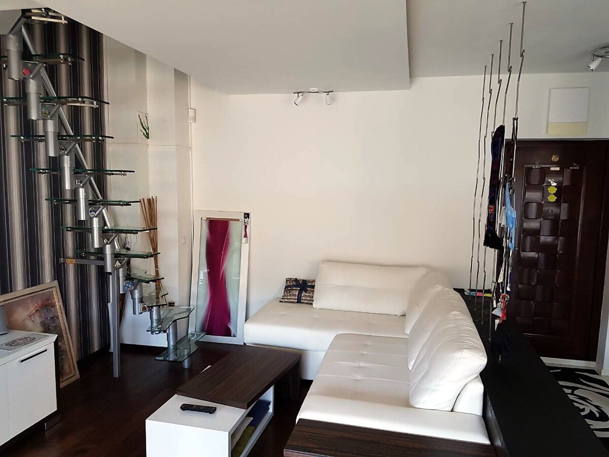 Апартаментът е разположен на две нива - на първото ниво има просторна дневна с кухня и трапезария, тераса, баня с тоалетна, а на второто ниво - спалня с вана.
