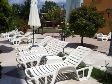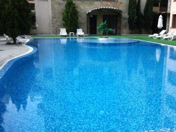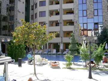 На територията на комплекса - градина, плувен басейн с детска секция, рецепция, паркинг, охрана.