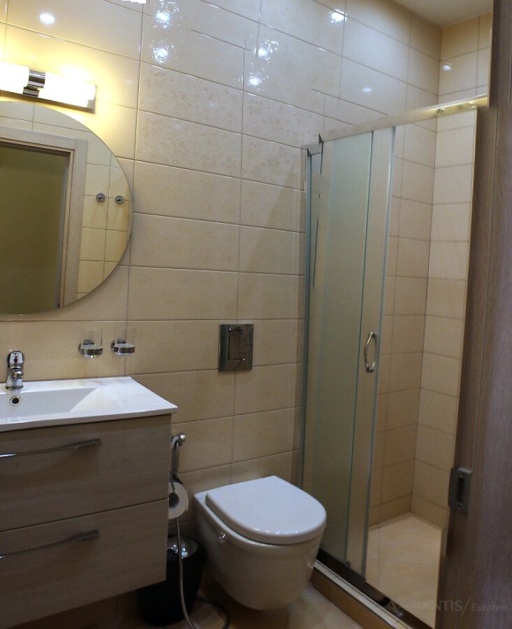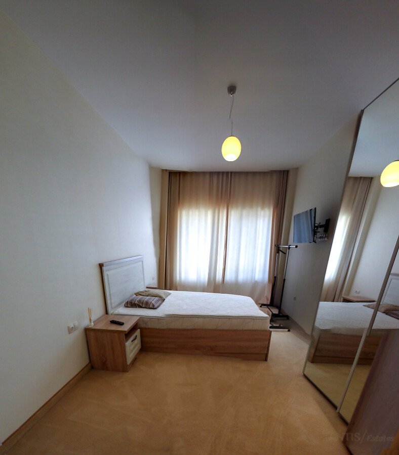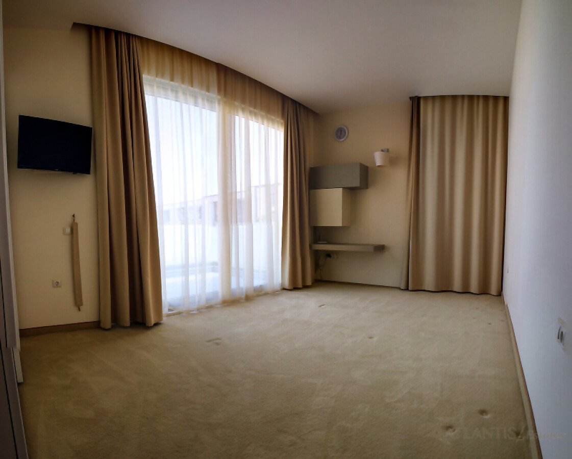 На първия етаж има голяма всекидневна с кухня и трапезария, килер, баня, просторна веранда и самостоятелен двор с изглед към басейна.