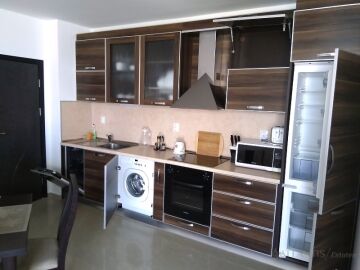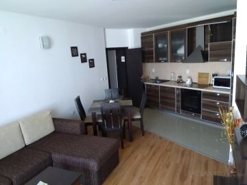 Апартаментът е напълно обзаведен – в дневната има горни и долни кухненски шкафове, маса за хранене и четири стола, ъглова мека мебел с холна маса; на терасата са поставени маса и два стола, а спалнята е оборудвана с двойно легло с нощни шкафчета, гардероб с плъзгащи се врати и тоалетка с огледало.
