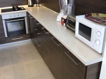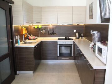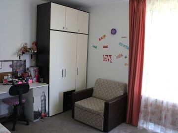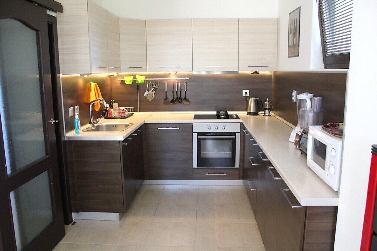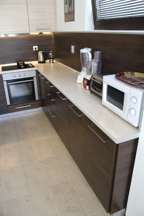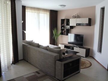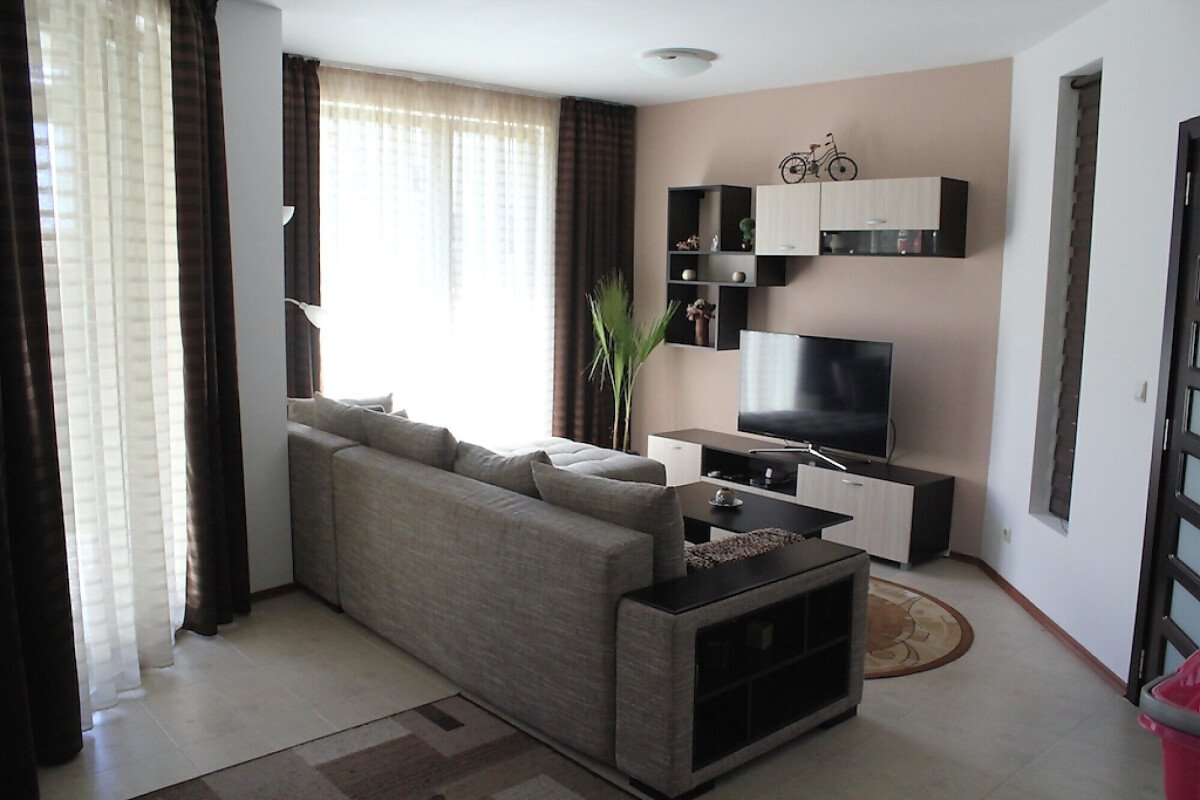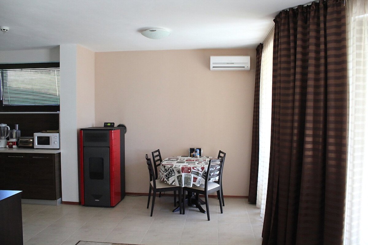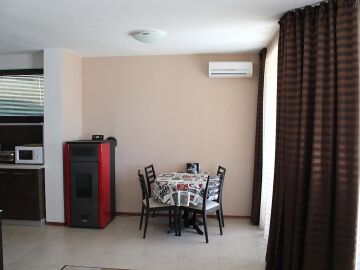 Къщата е много уютна, стилно обзаведена с качествени мебели по поръчка. Разполага с камина с пелети.