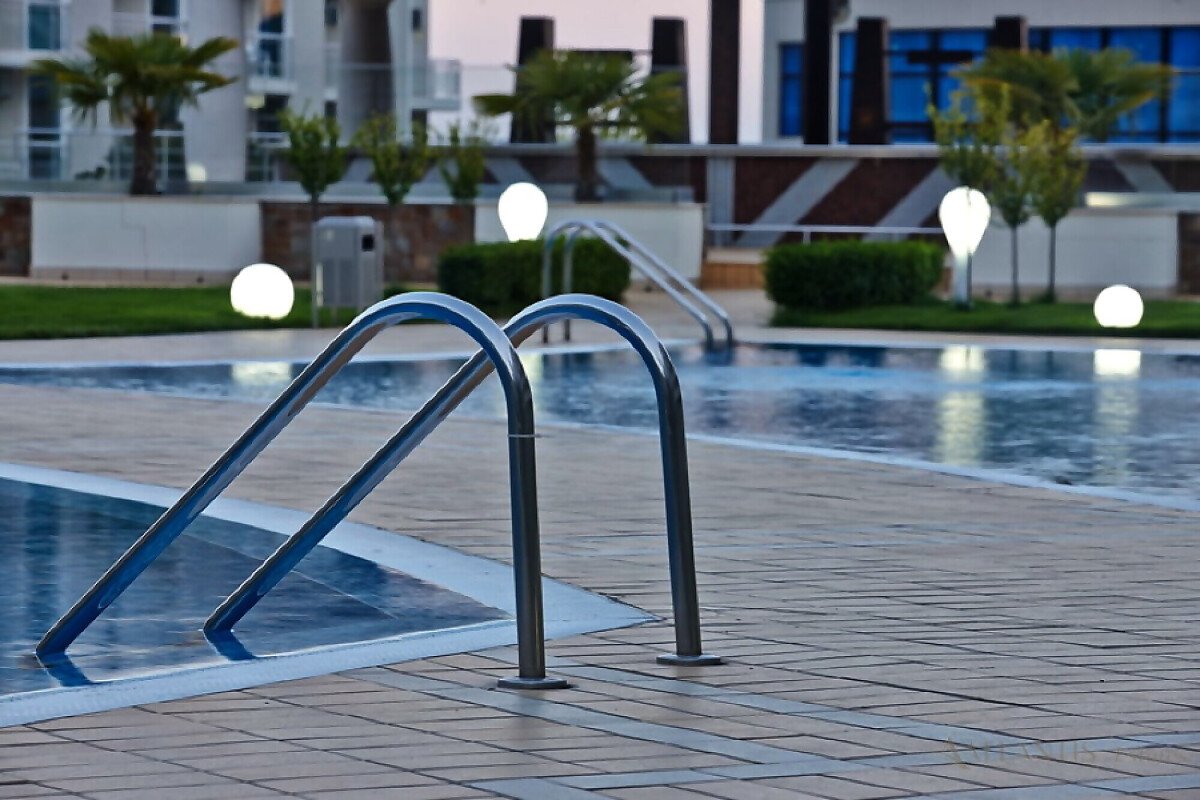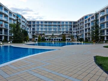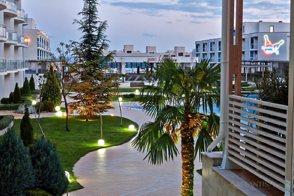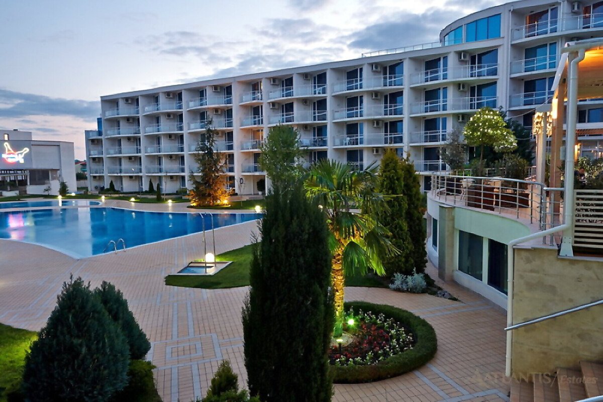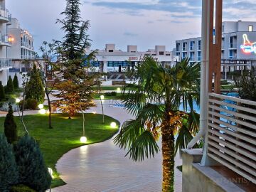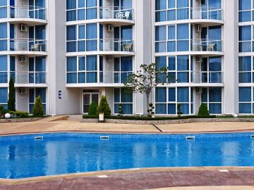 Апартаментът е с изглед към басейна и се продава напълно обзаведен и оборудван.