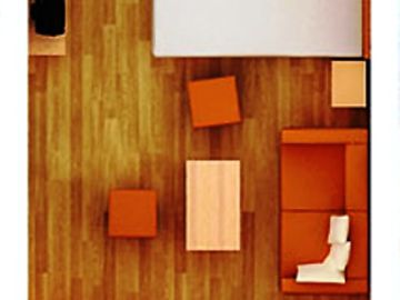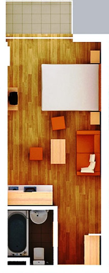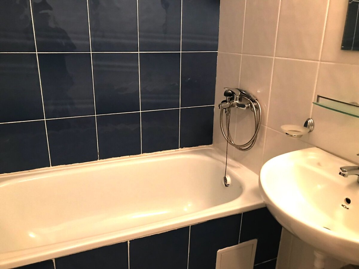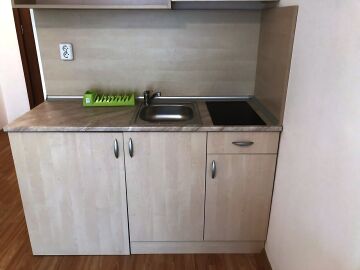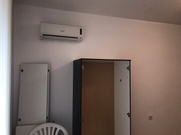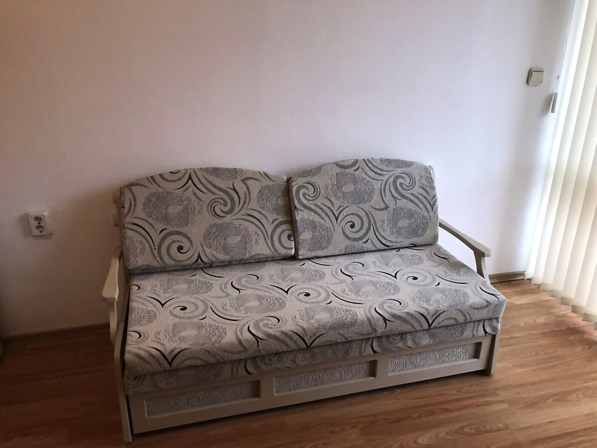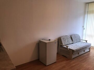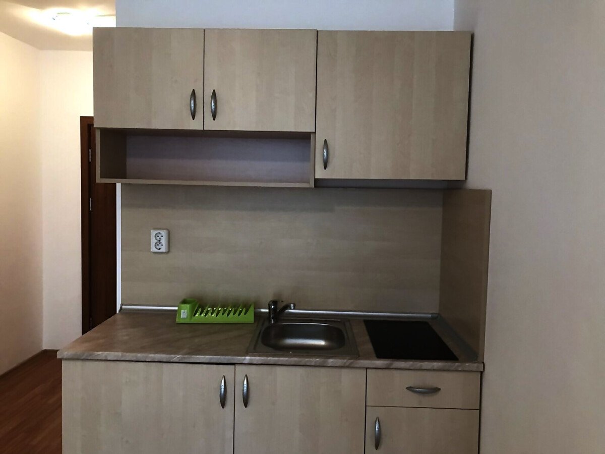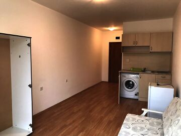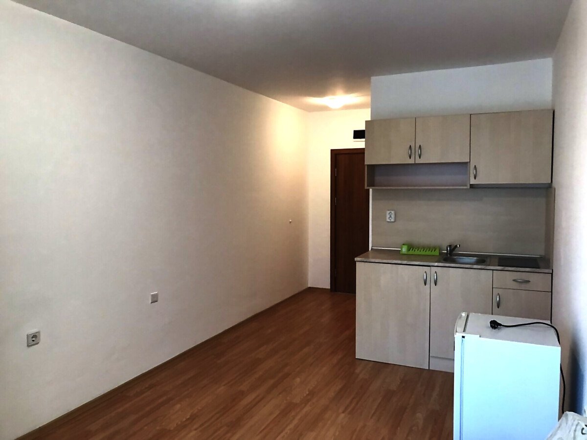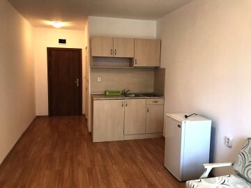 Апартаментът разполага с кухненски бокс, хладилник, мека мебел и напълно оборудвана баня. Големите прозорци позволяват помещението да е добре осветено от слънчевите лъчи и придават уют, подовата настилка е ламиниран паркет, стените са боядисани с латекс.