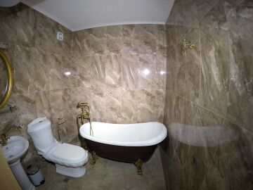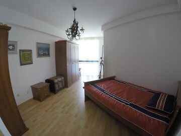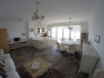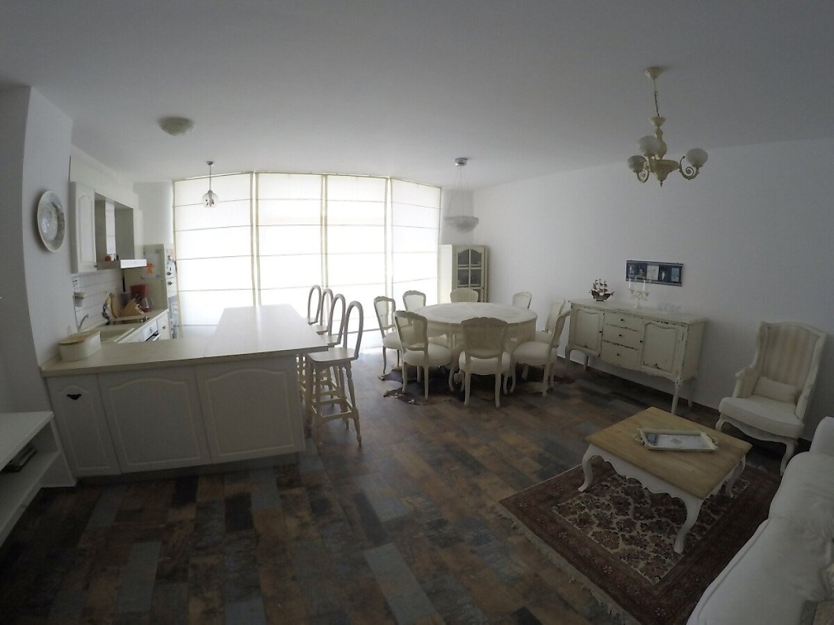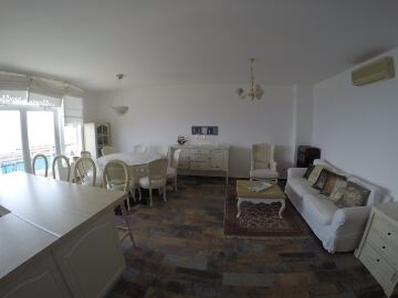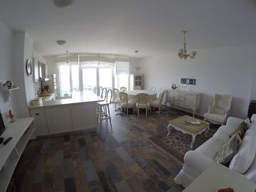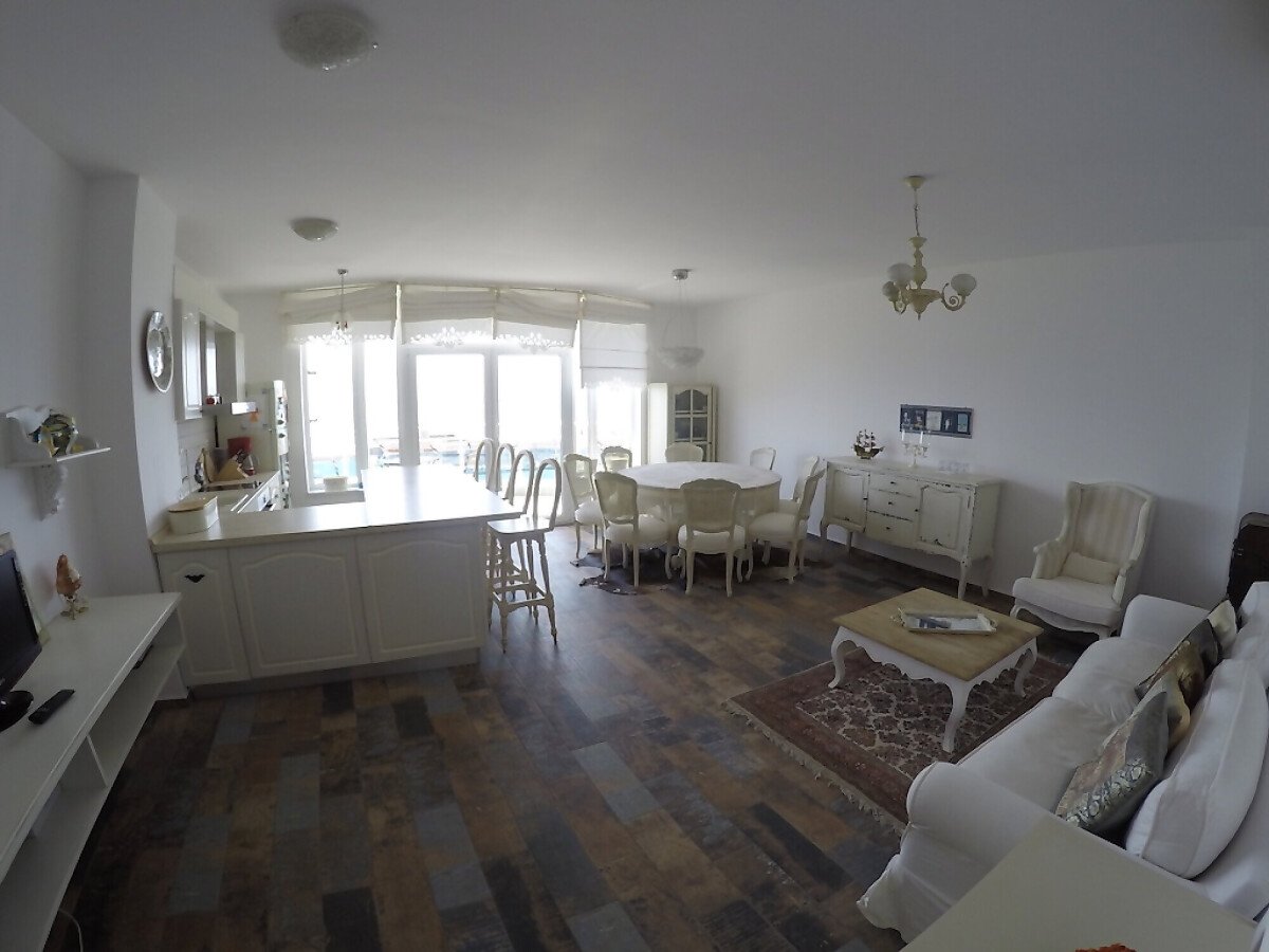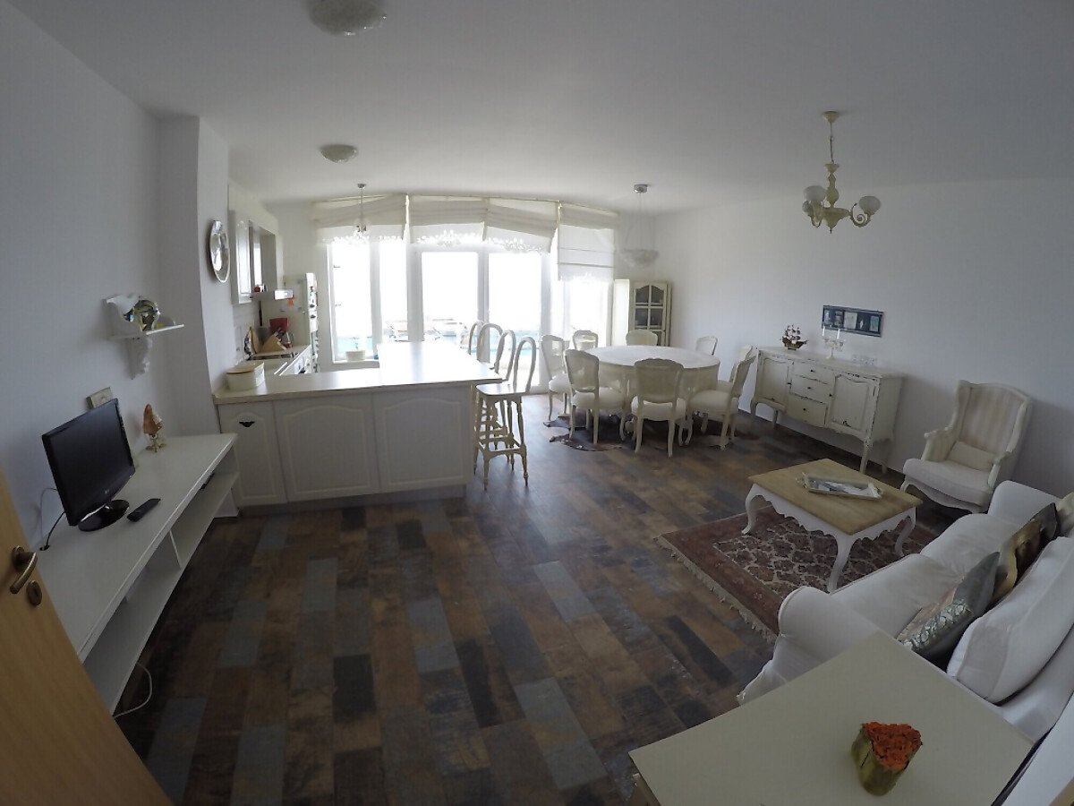 Площта на апартамента е 120 кв.м и се състои от дневна с кухня, две спални, баня с тоалетна и страхотна голяма тераса, от която се разкрива гледка към морето. Жилището е просторно и обзаведено с луксозни мебели.