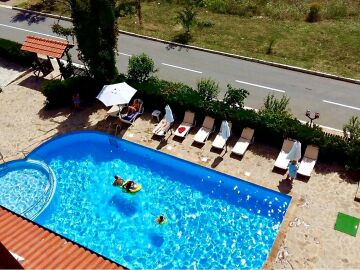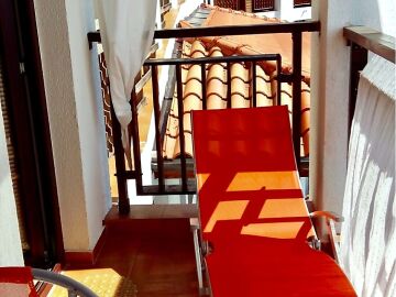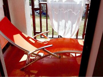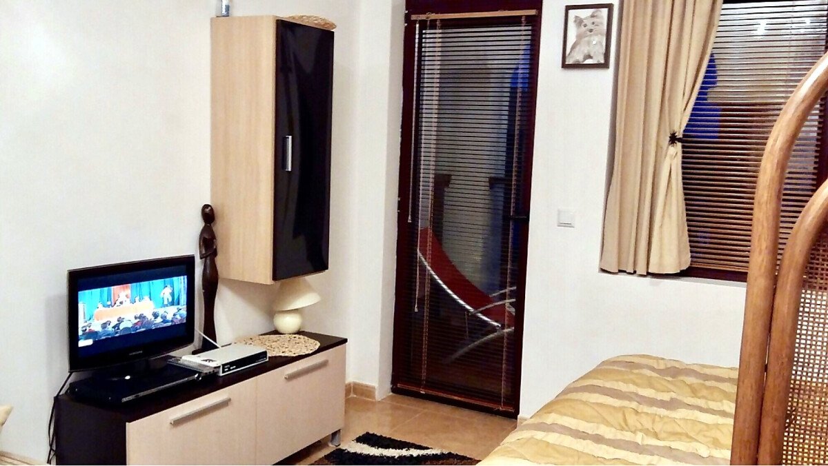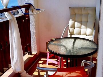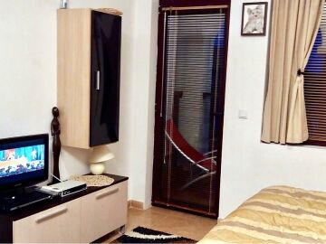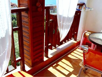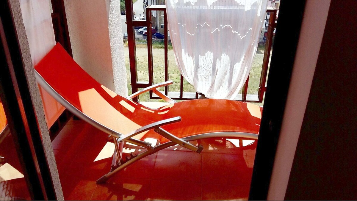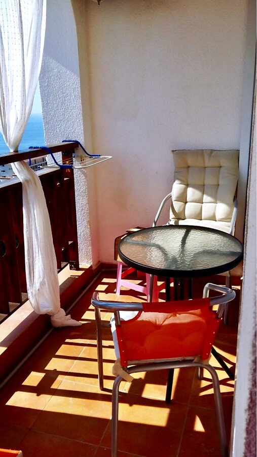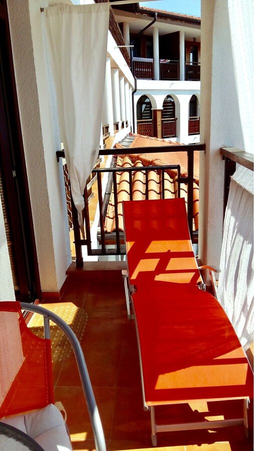 Гледката от терасата на студиото е към морето и басейна на комплекса.