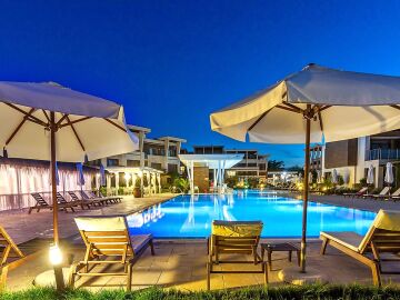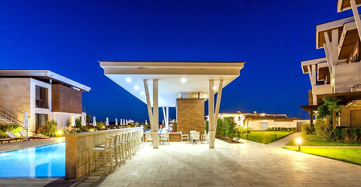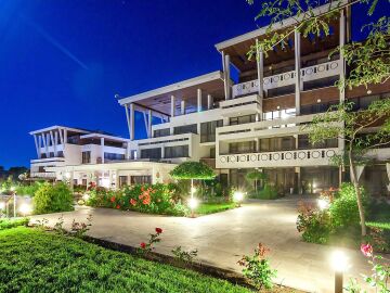 Архитектурата на комплекса е съвременна, а озеленената градина, която се слива заедно с брега на морето, придава още повече разкош.