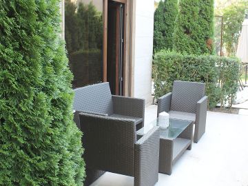 Жилището е с площ от 39.37 кв. м, терасата е с гледка към двора на комплекса.