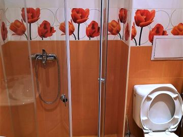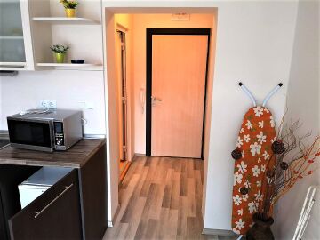 Студиото е с площ 38.00 кв. м, обзаведено е и разполага с коридор, отделна баня с тоалетна и тераса с изглед към басейна и двора на хотела.