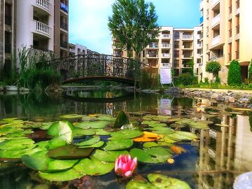 Изгледът от терасата на жилището е към басейна на комплекса.