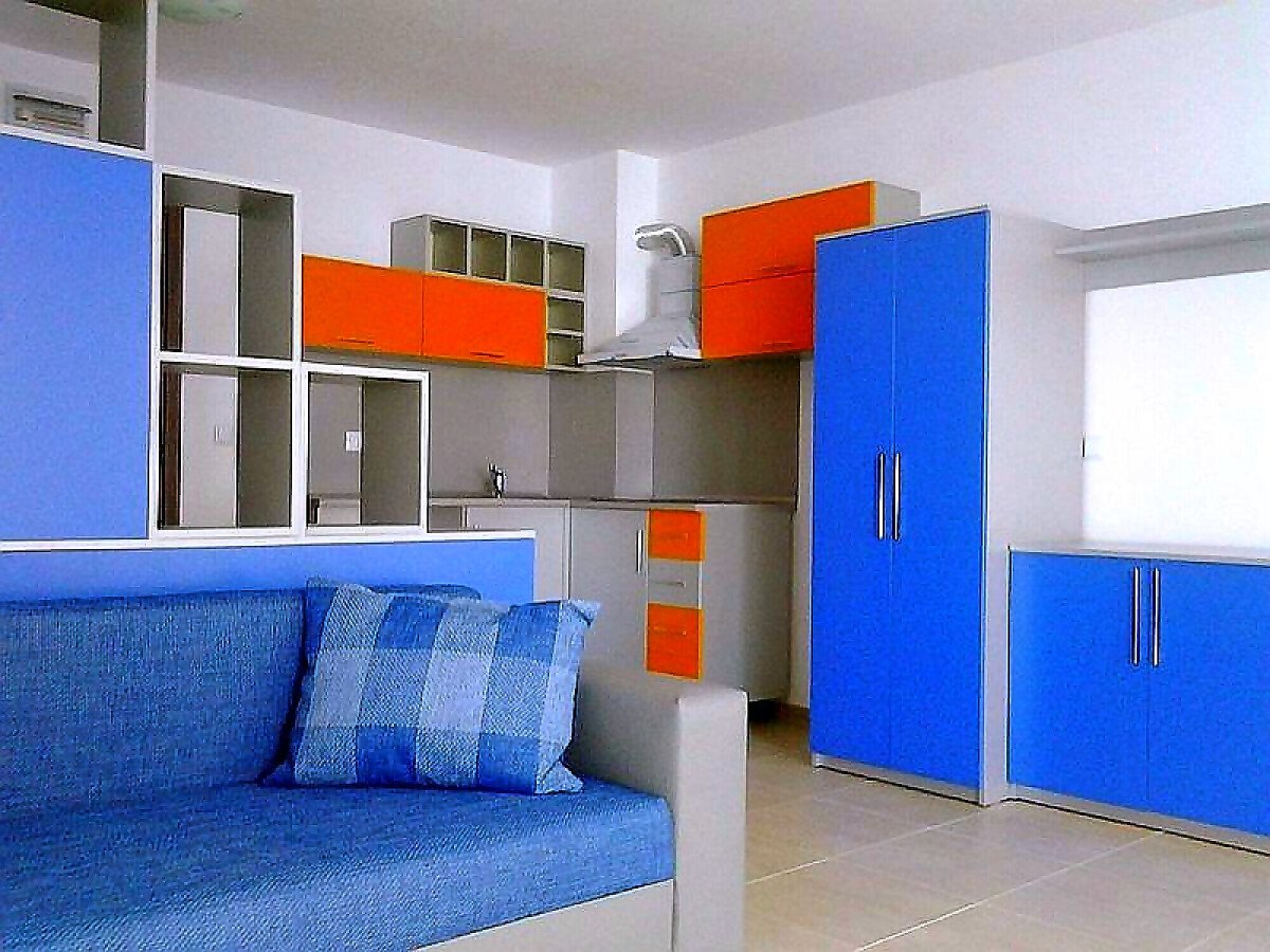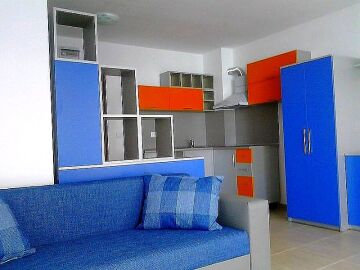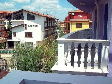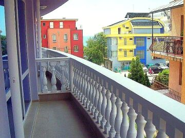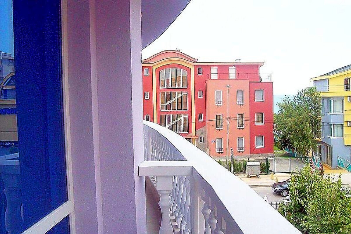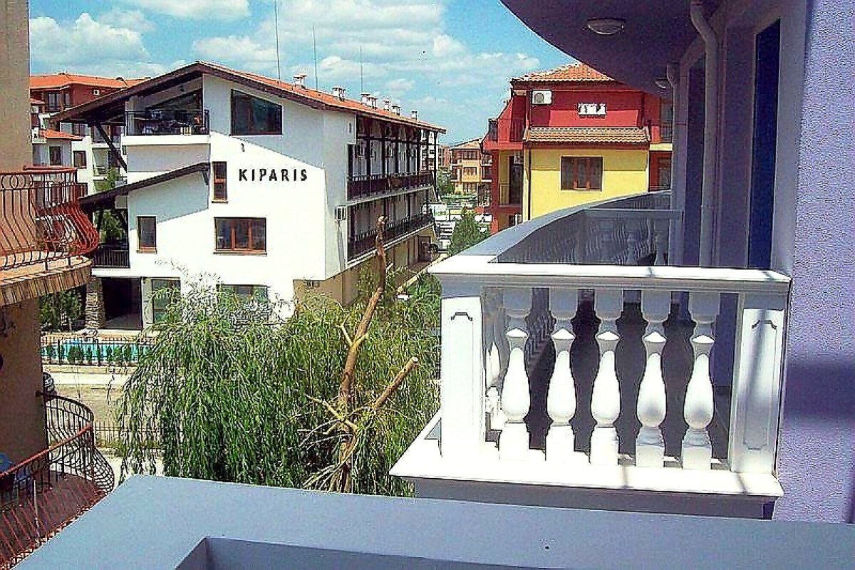 Студиото е просторно и обзаведено, с невероятна гледка към морето и двора на комплекса.