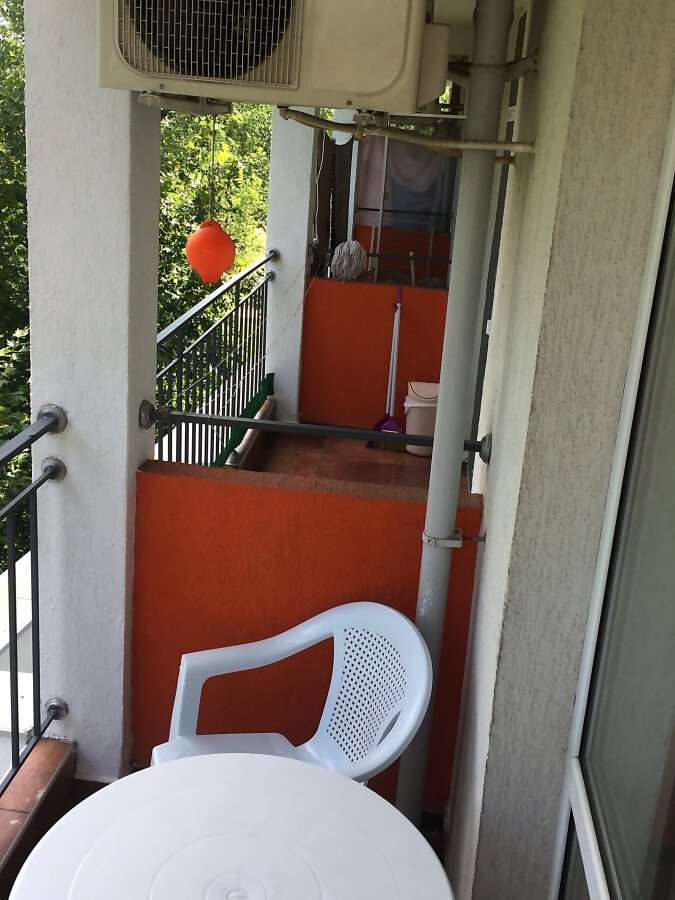 Жилището е обзаведено, мебелите в апартамента са в много добро състояние. Имотът се предлага с голямо двойно легло, диван, телевизор и кухненски принадлежности. Апартаментът разполага с просторна красива тераса.