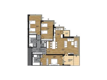 Апартаментът е просторен и необзаведен с жилищна площ 198.44 кв. м - разполага с три спални, кухня, хол, две бани с тоалетна и тераса.