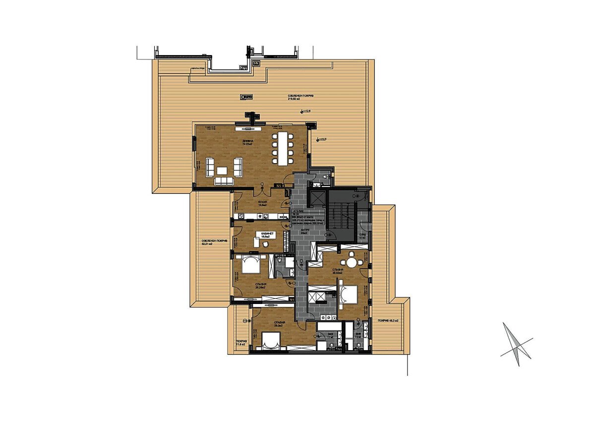Пентхаусът разполага още с озеленен покрив, басейн и голяма тераса с площ 303.6 кв. м.