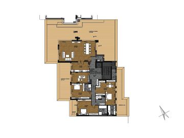 Пентхаусът е просторен и необзаведен с жилищна площ 363.20 кв. м - разполага с кухня и зона за трапезария, кабинет, складово помещение, три спални и четири бани с тоалетна.