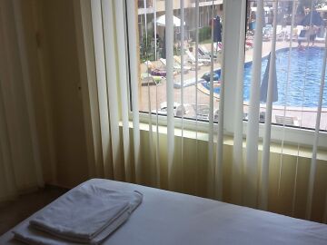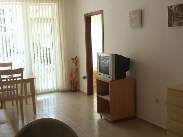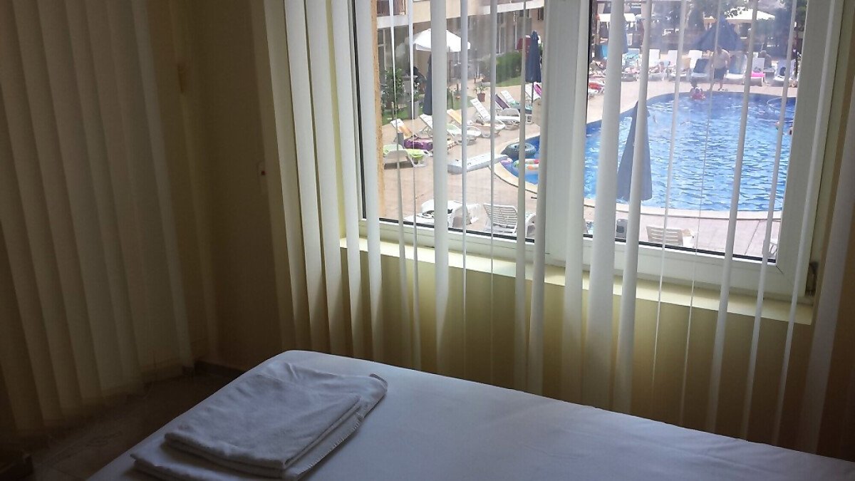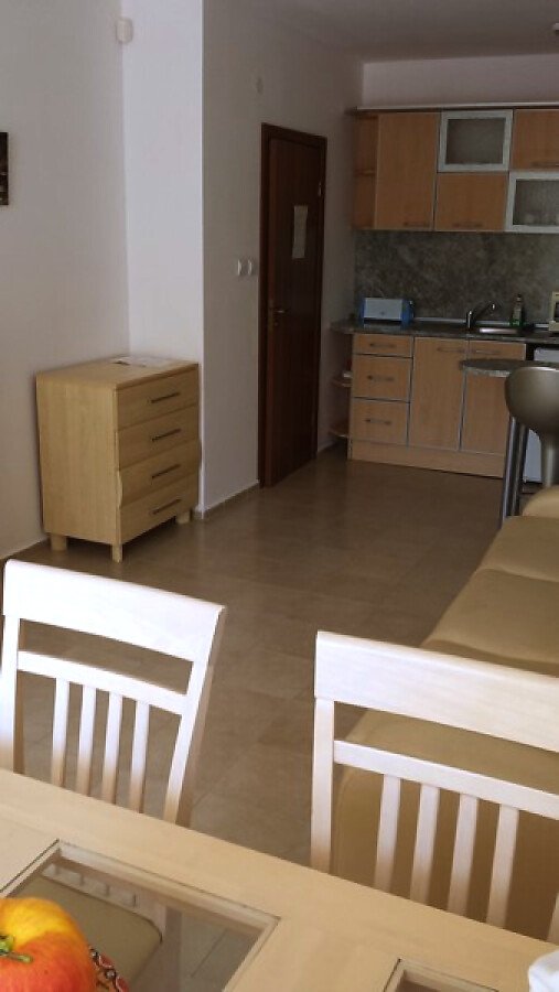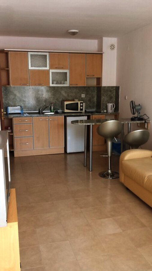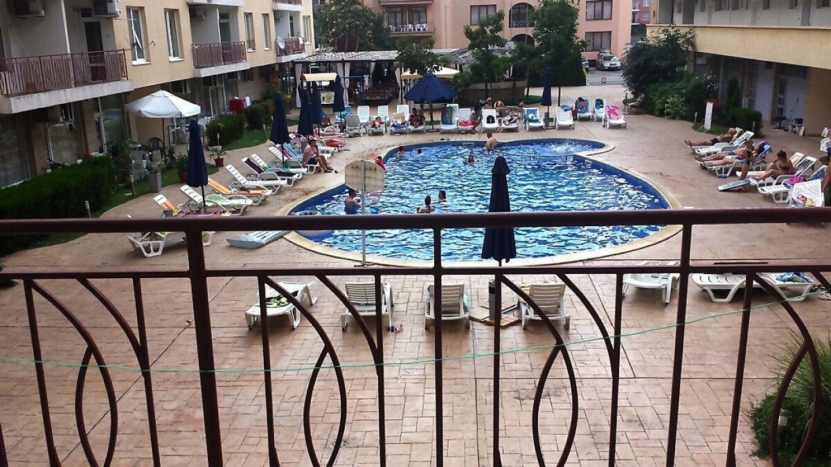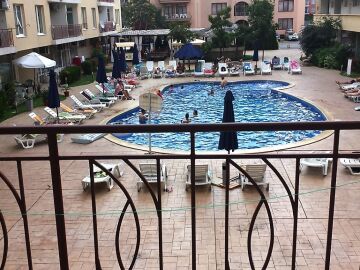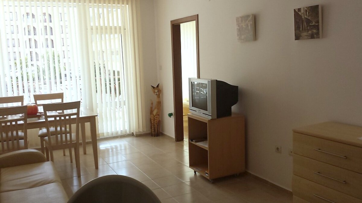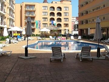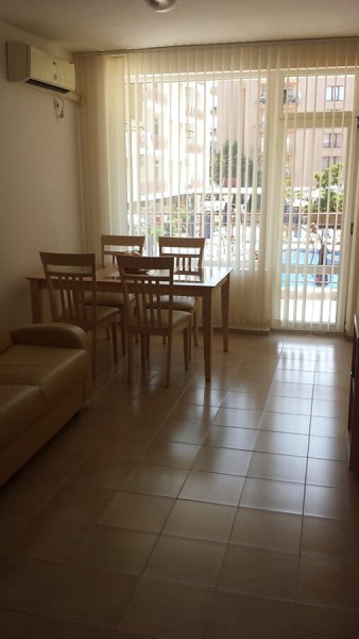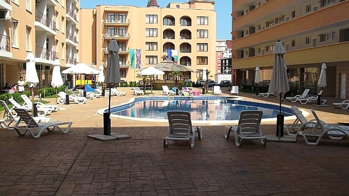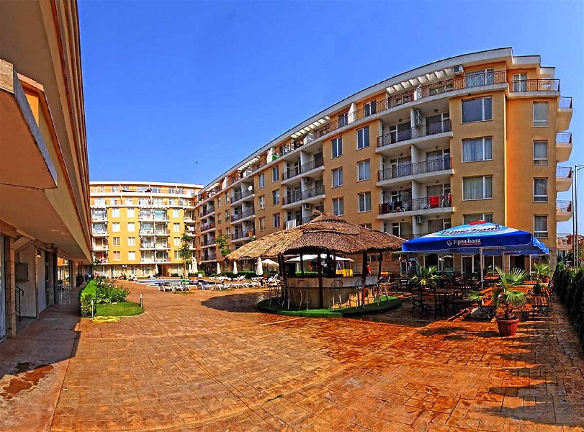 Апартаментът се намира в комплекс, който е разположен в тихата и спокойна част на курорта и разполага с открит басейн, рецепция, бар и се намира само на 450 м от плажа на Слънчев бряг.