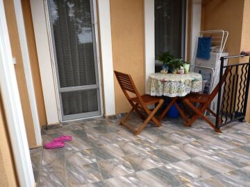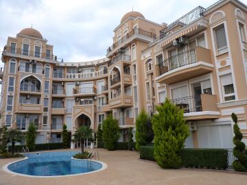 Апартаментът е с жилищна площ 46.00 кв. м и разполага с тераса - 8 кв. м - която е с изглед към басейна и двора на комплекса.