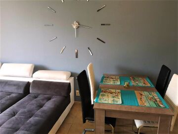 Жилището е ремонтирано - спалнята, кухнята заедно с трапезарията и хола и банята с тоалетна са обзаведени и оборудвани с луксозни и стилни мебели и техника.