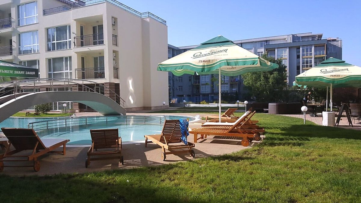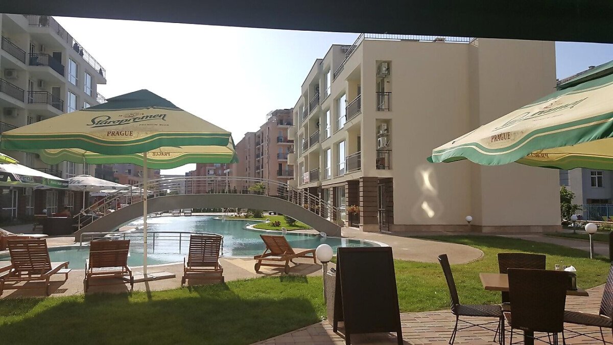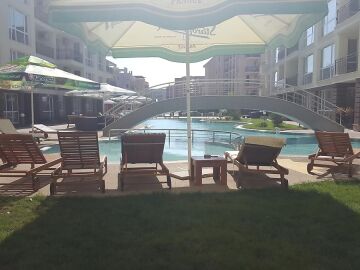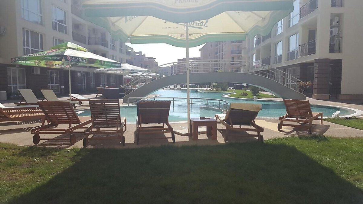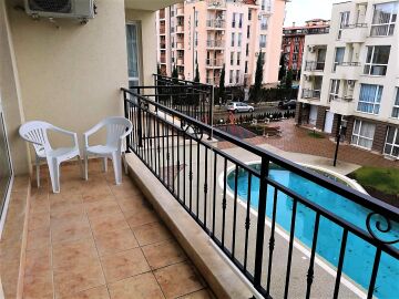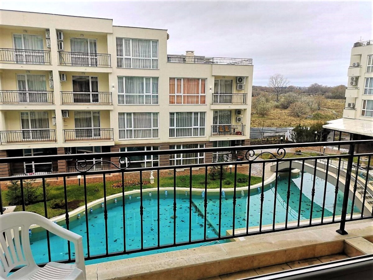 Студиото е с жилищна площ 37.00 кв. м и разполага с изглед към басейна на комплекса.
