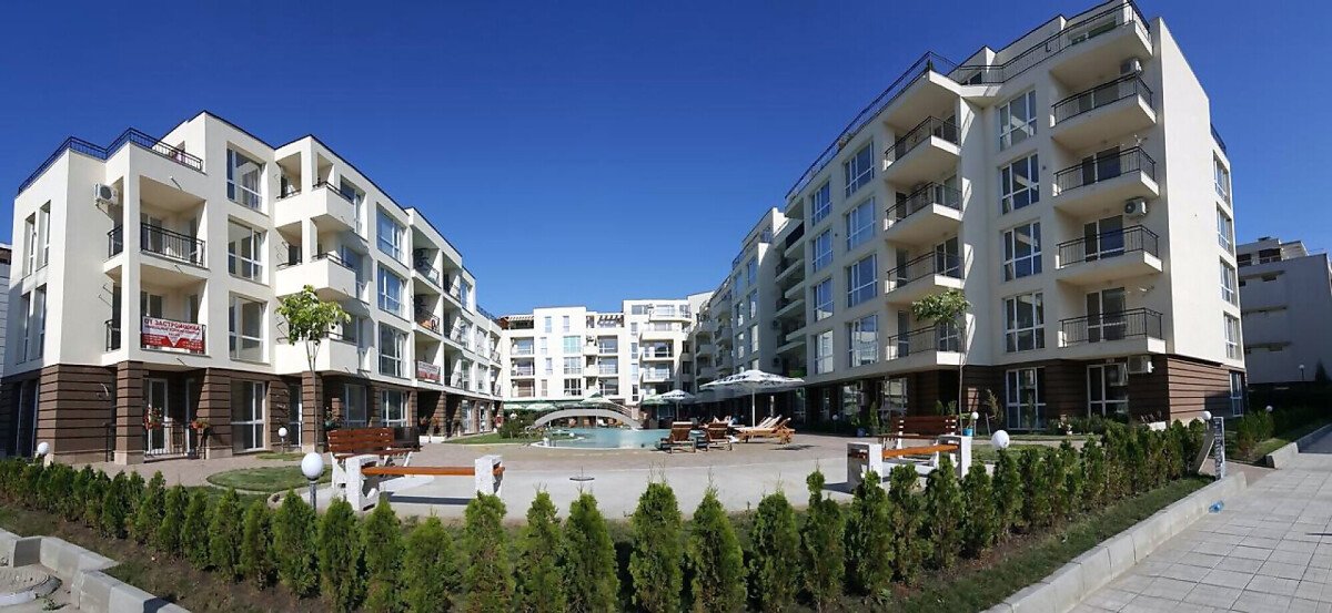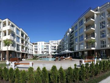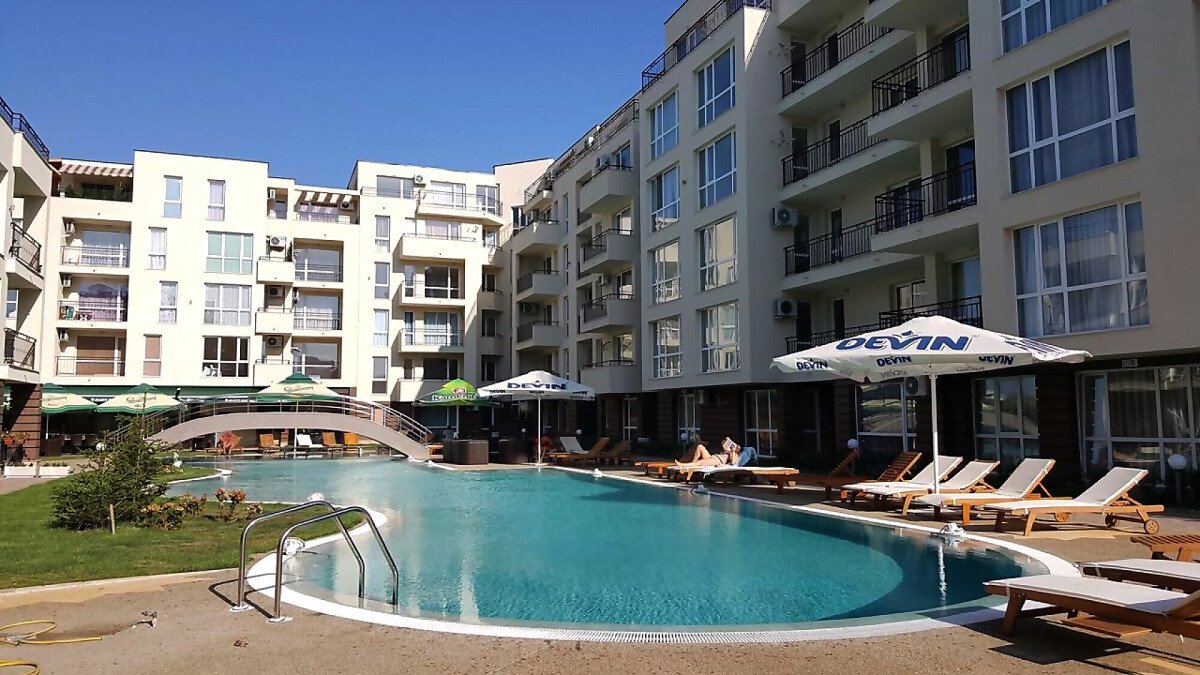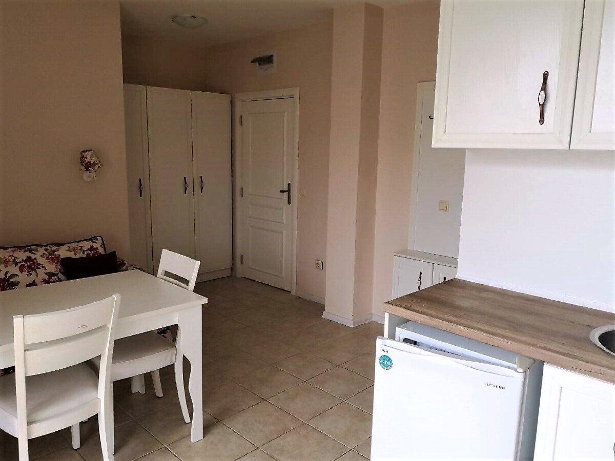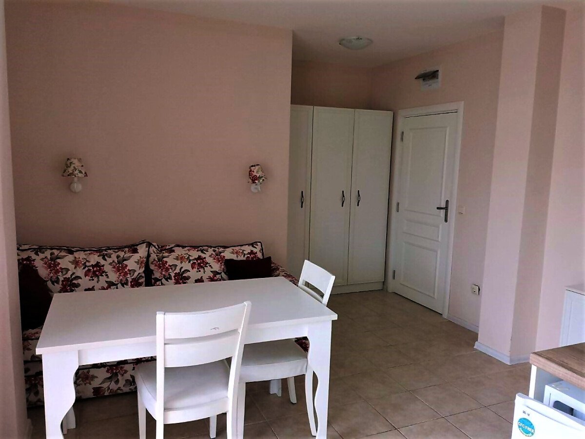Студиото е с жилищна площ 37.00 кв. м и разполага с изглед към басейна на комплекса.