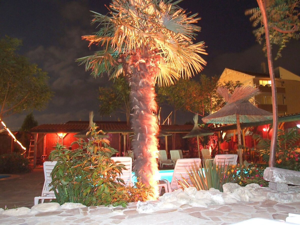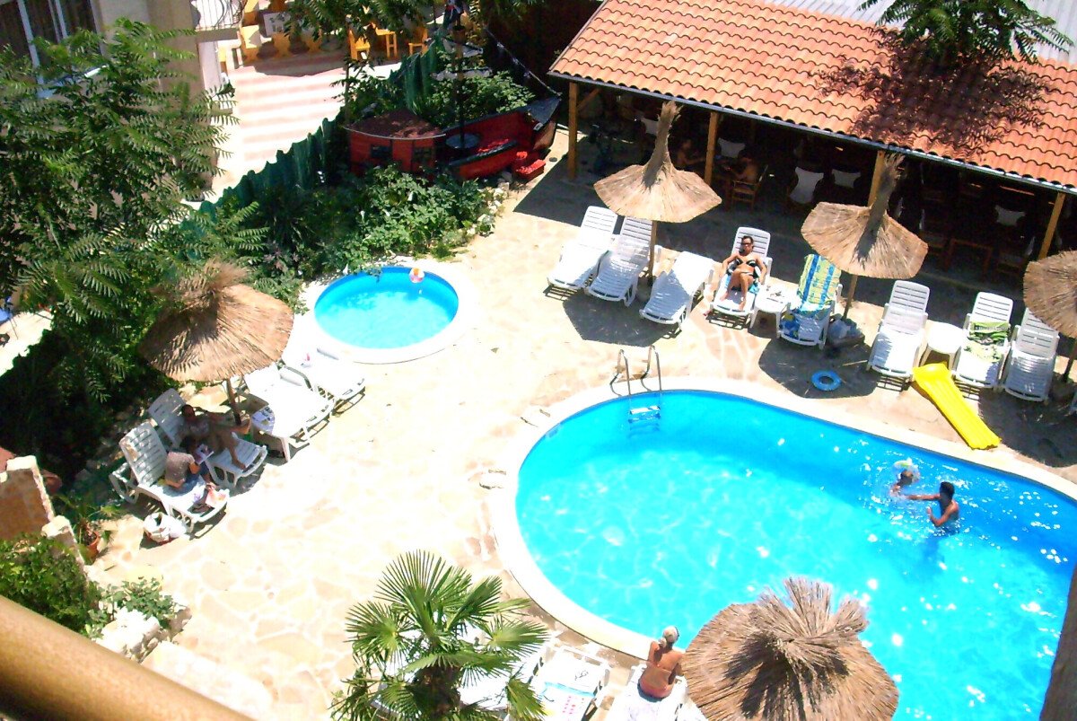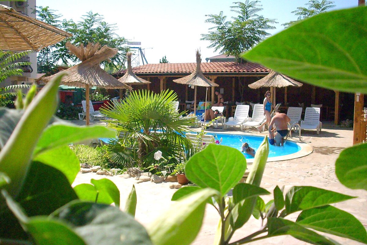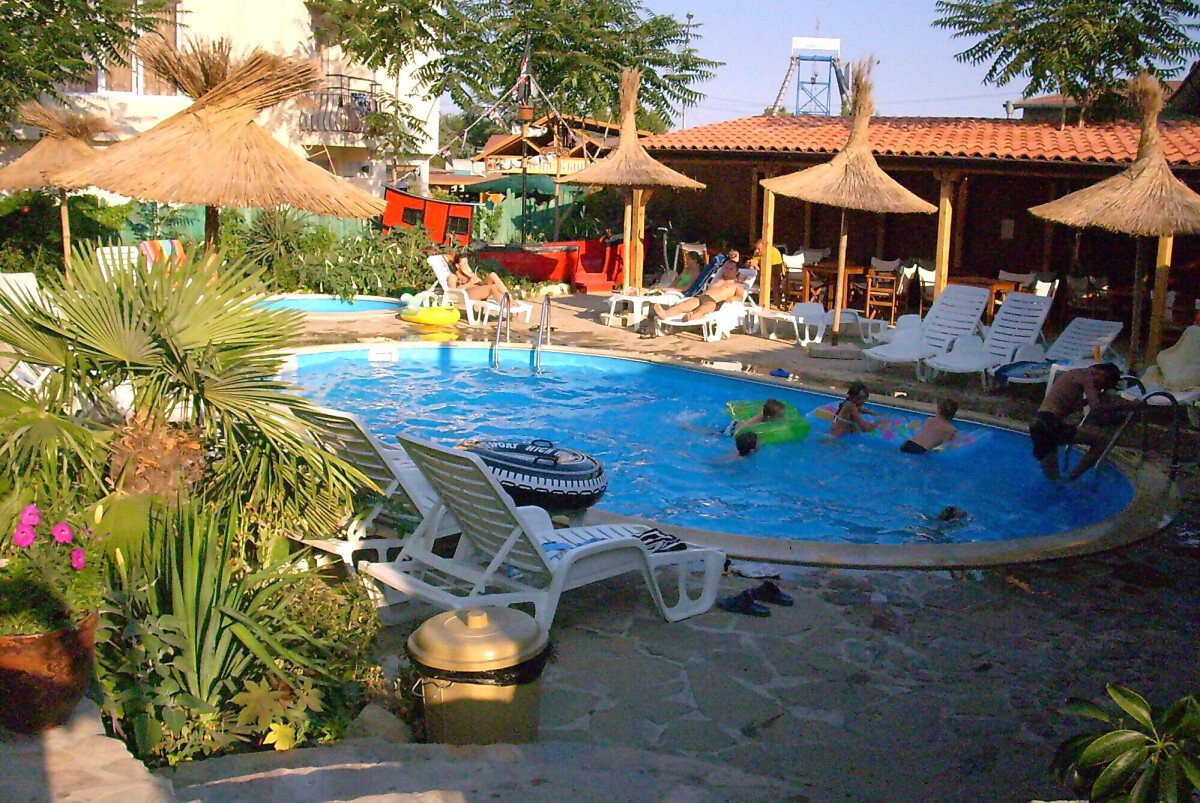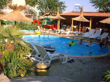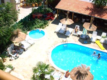 Сред зеленината на добре поддържана градина са разположени два плувни басейна, единият от които е специално проектиран за деца. Край басейна са разположени шезлонги и сламени чадъри, допълвани от палми, които създават неповторима тропическа атмосфера за почиващите. До басейна има тоалетни помещение и душ.
