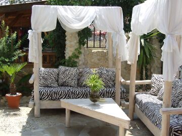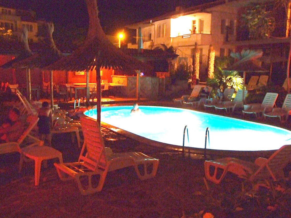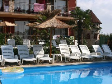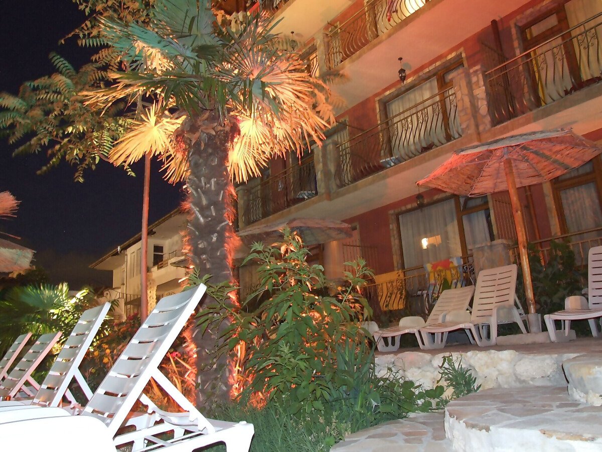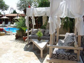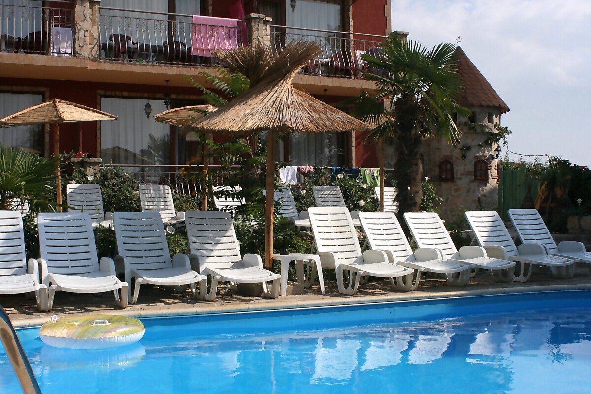 Сред зеленината на добре поддържана градина са разположени два плувни басейна, единият от които е специално проектиран за деца. Край басейна са разположени шезлонги и сламени чадъри, допълвани от палми, които създават неповторима тропическа атмосфера за почиващите. До басейна има тоалетни помещение и душ.