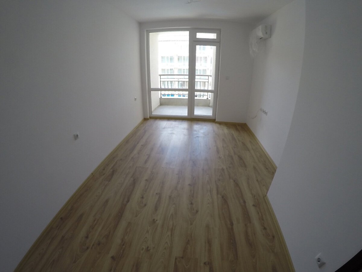 Апартаментът е необзаведен - има една спалня, всекидневна, баня с тоалетна и тераса с изглед към басейна на комплекса.
