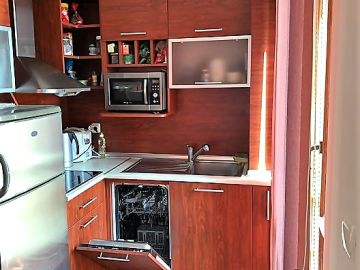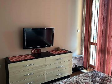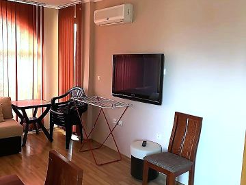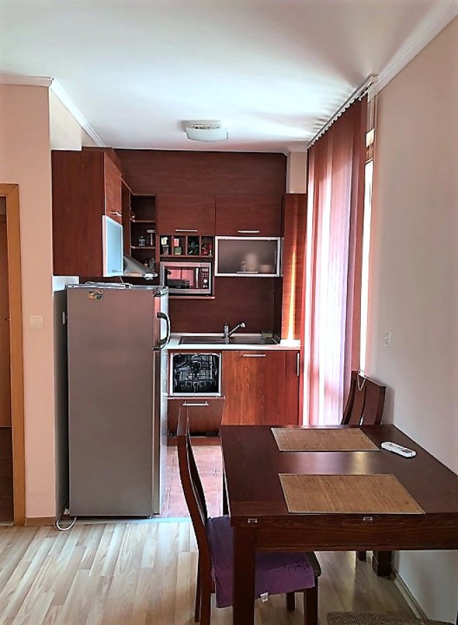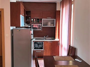Апартаментът е просторен и уютно обзаведен - разполага с една спалня, кухня заедно с трапезария и хол, баня с тоалетна и тераса с изглед към басейна на комплекса.