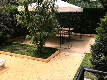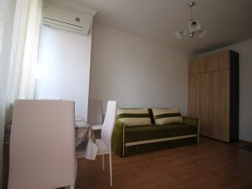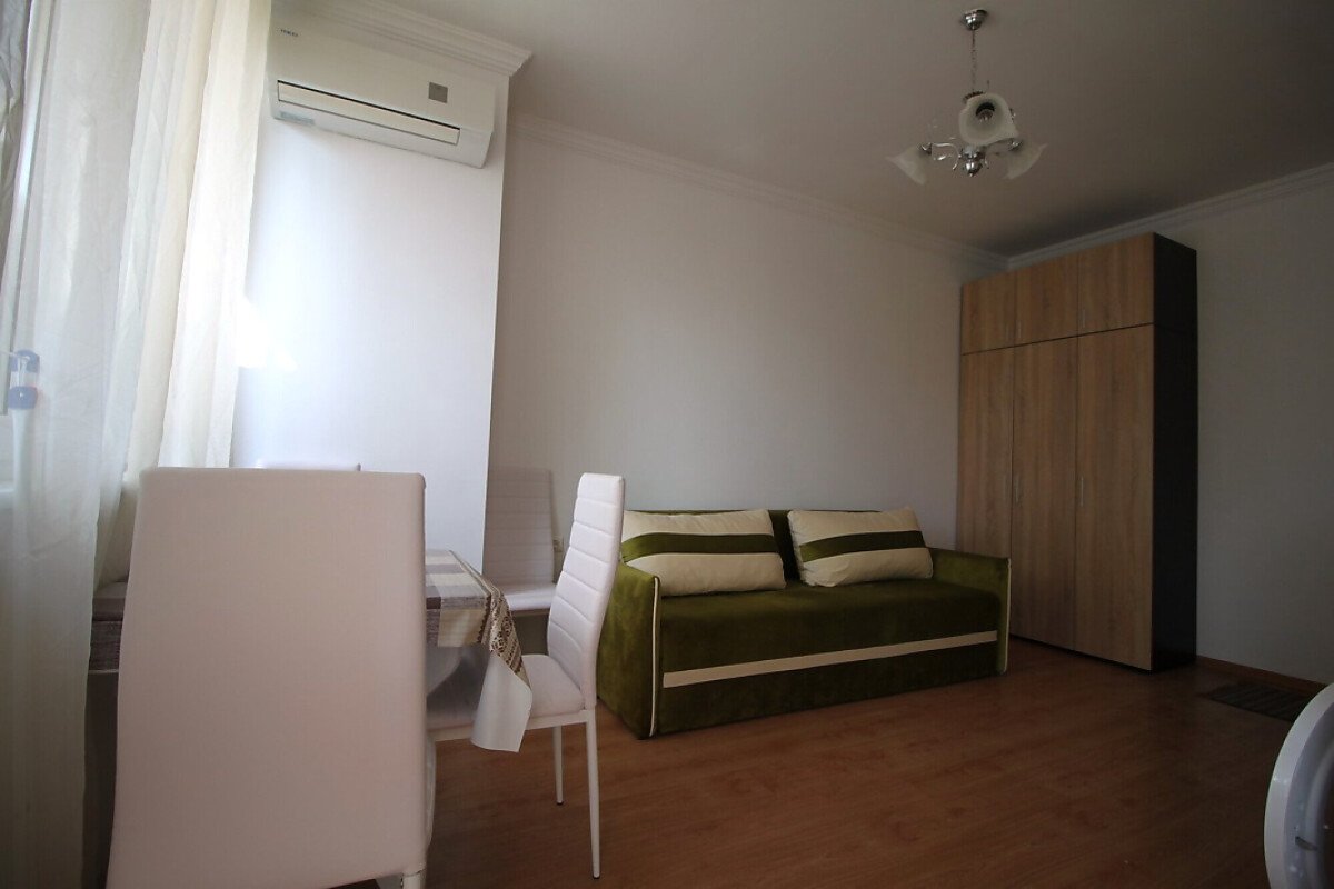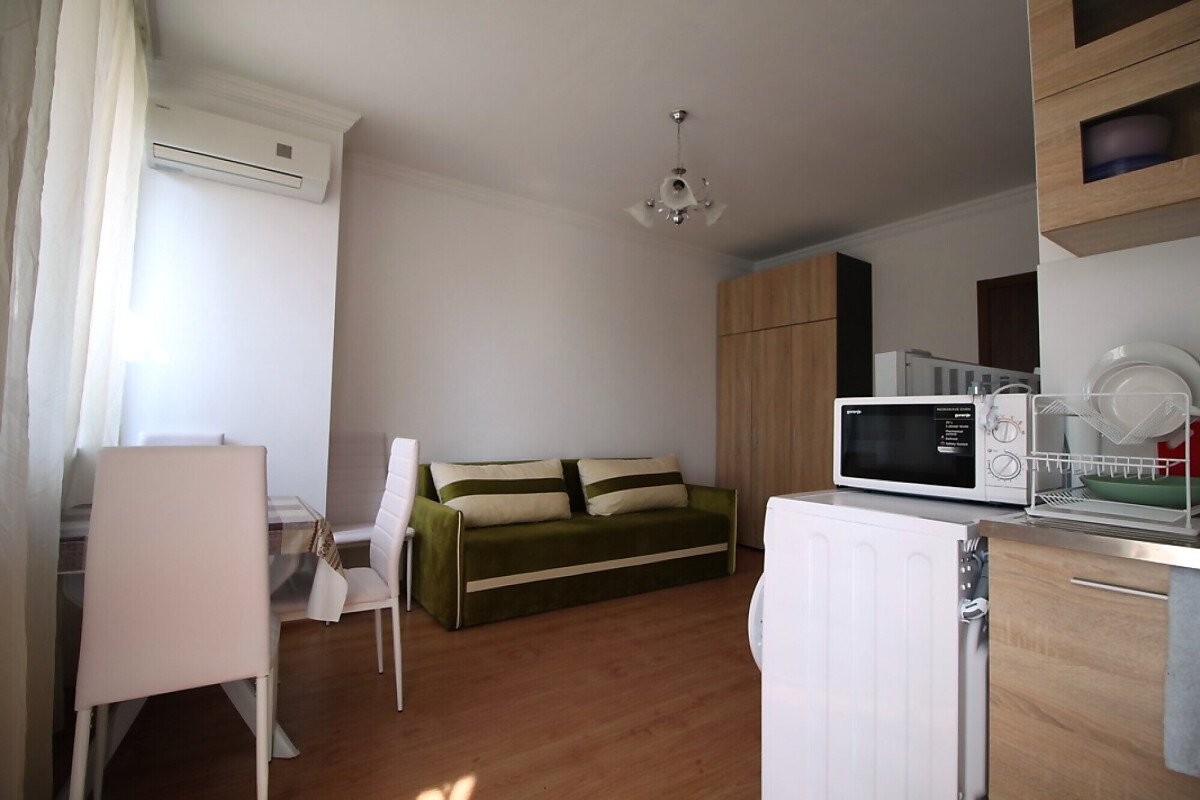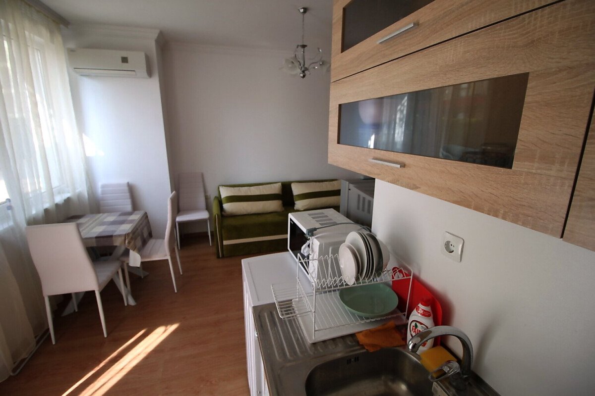 Студиото се продава с мебели и уреди, както е на снимките. Изглед от балкона към тиха улица и красиво озеленен двор.