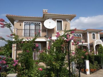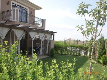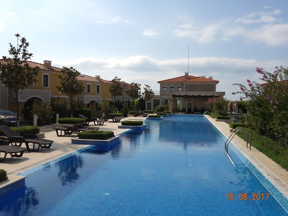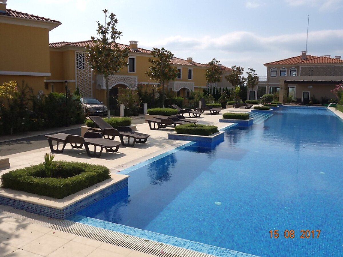 Къщата е с елегантен дизайн и е разположена в затворен луксозен комплекс с красиви зелени площи и басейн.