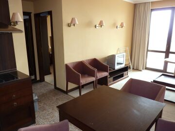 Апартаментът е разположен на осми етаж и предлага страхотна гледка към курорта. Изцяло обзаведен с качествени и стилни мебели, красив дизайн и усещане за комфорт и уют.