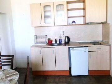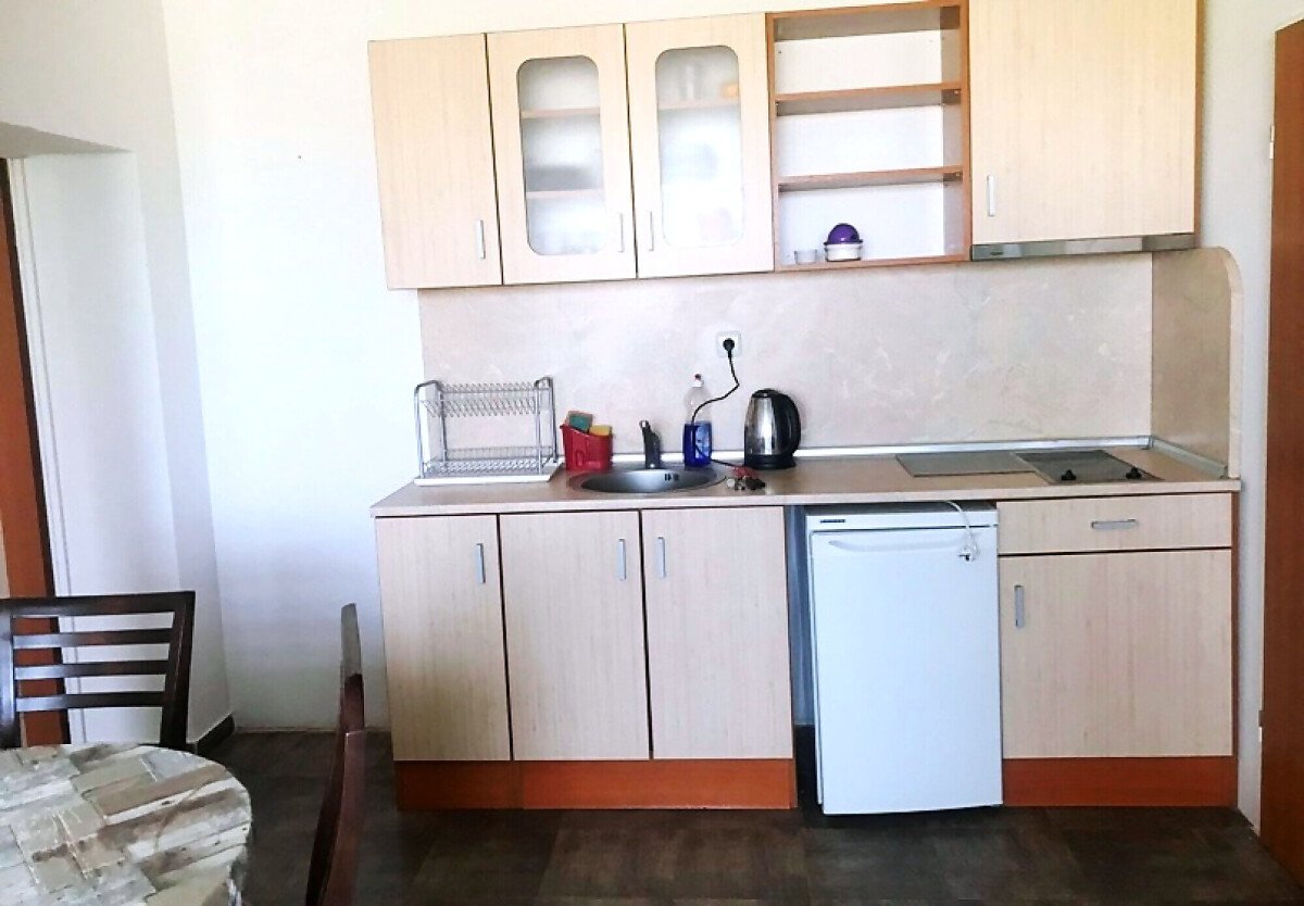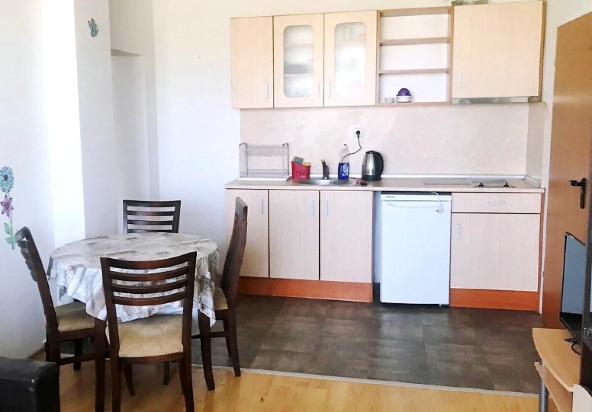 Апартаментът се намира на трети етаж и има следното разпределение: антре, просторна дневна с кухня, спалня, баня с тоалетна и голяма тераса с изглед към морето.