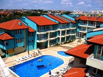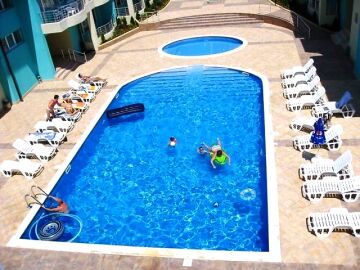 Разполага с басейн, кафене, рецепция, паркинг и охрана.