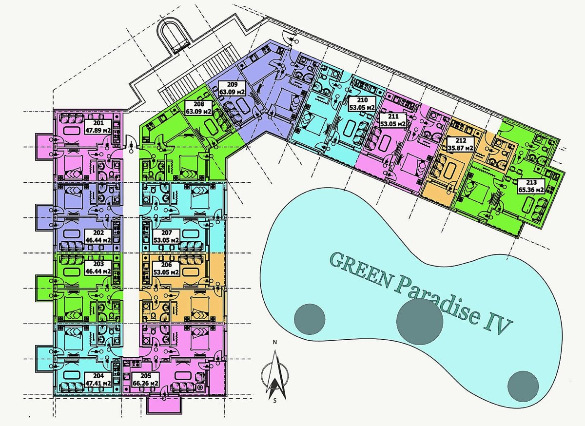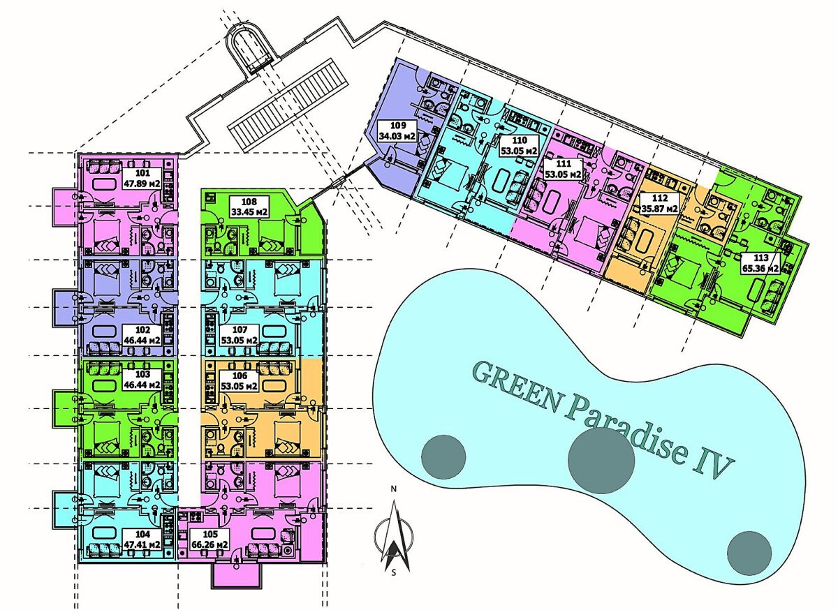 Комплексът разполага със студиа, двустайни и тристайни апартаменти.