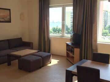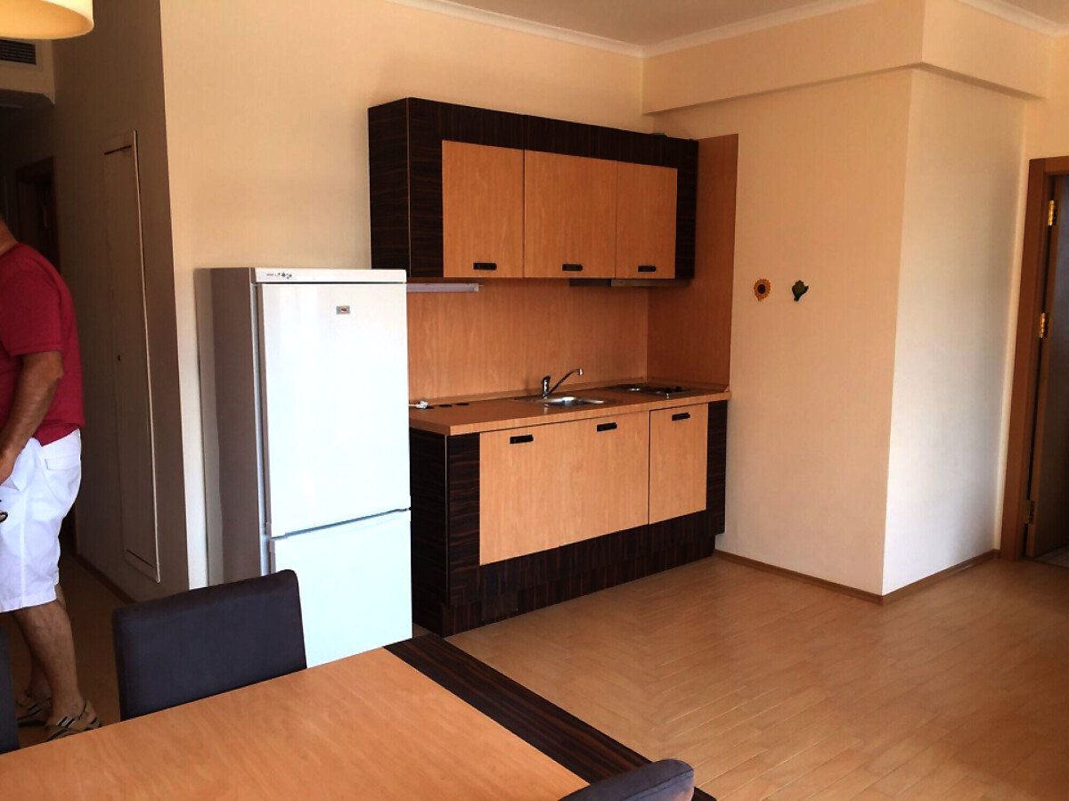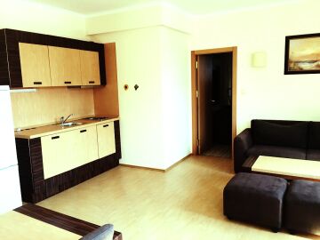 Апартаментът има коридор, кухня с трапезария и хол, една спалня, баня с тоалетна и тераса - с изглед към басейна, двора на хотела и морето.