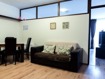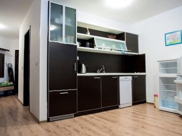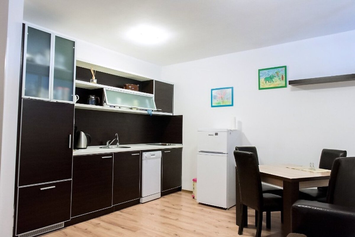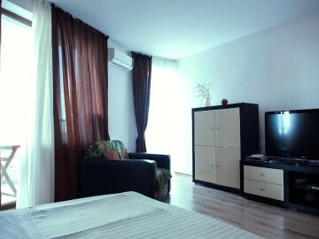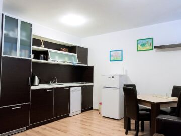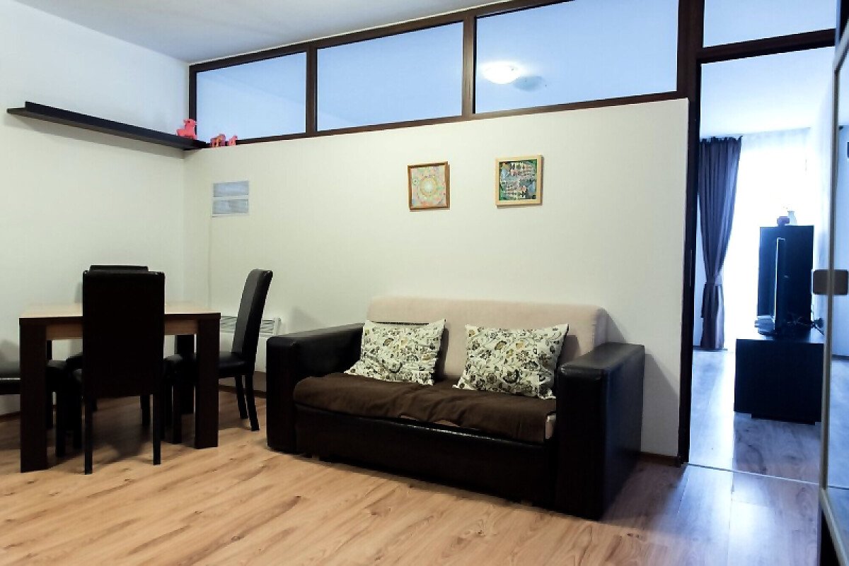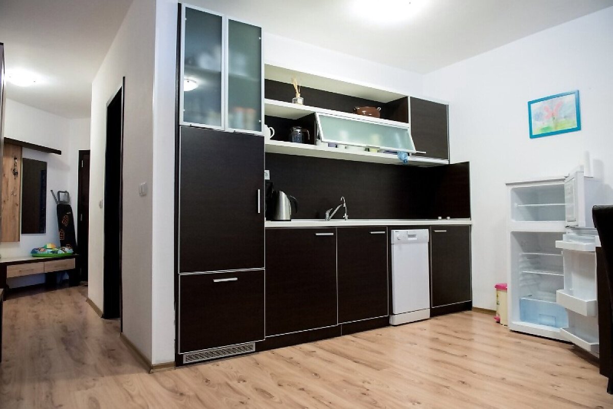 Апартаментът разполага с кухненски бокс, спалня, баня с тоалетна и тераса.